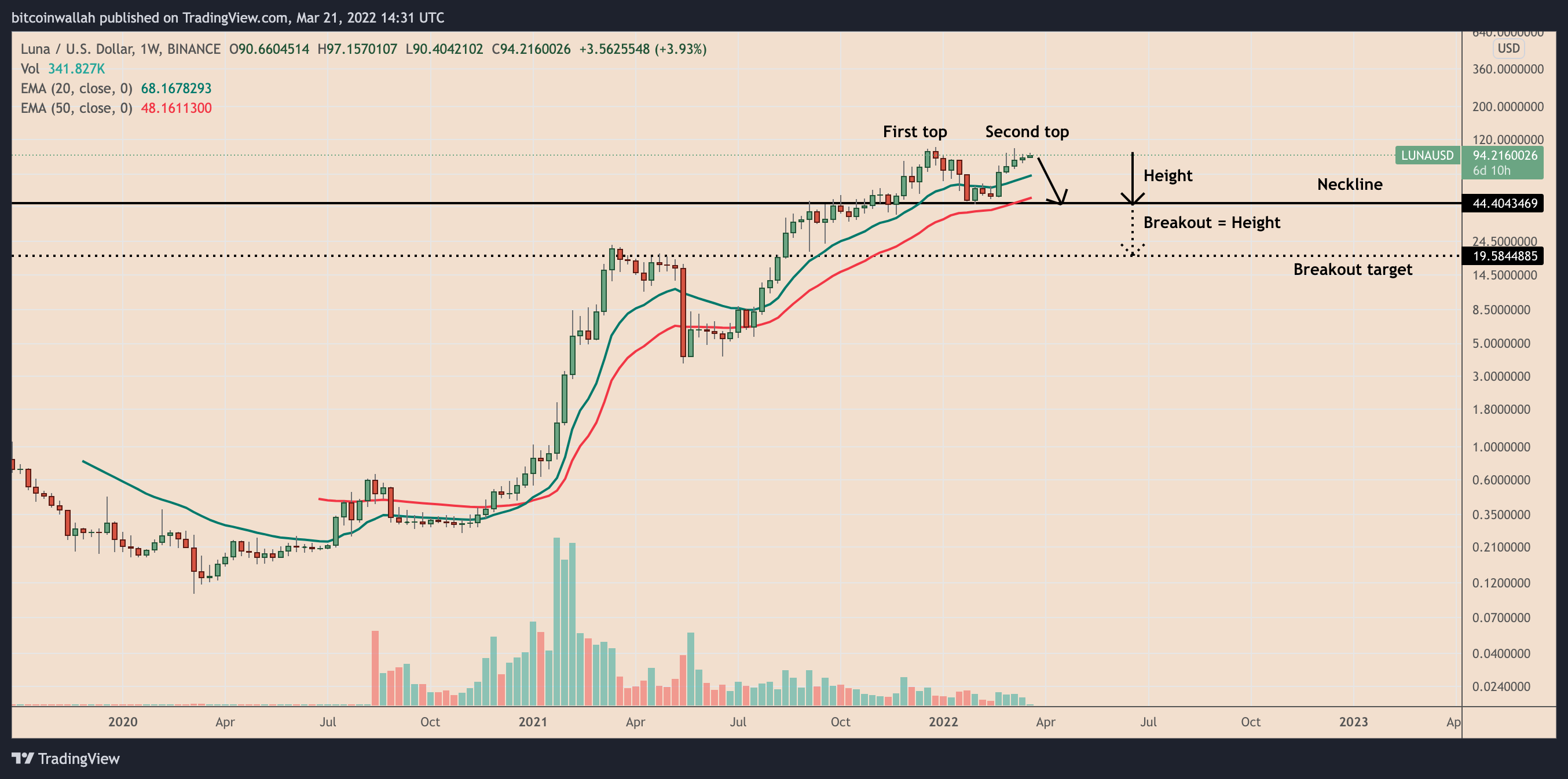 On the other hand, a pullback move from levels near $100 could also trigger the classic double-top setup, which entails two high points in the market, signifying an impending bearish reversal signal. LUNA could paint one in the coming weeks, as shown in the chart below.