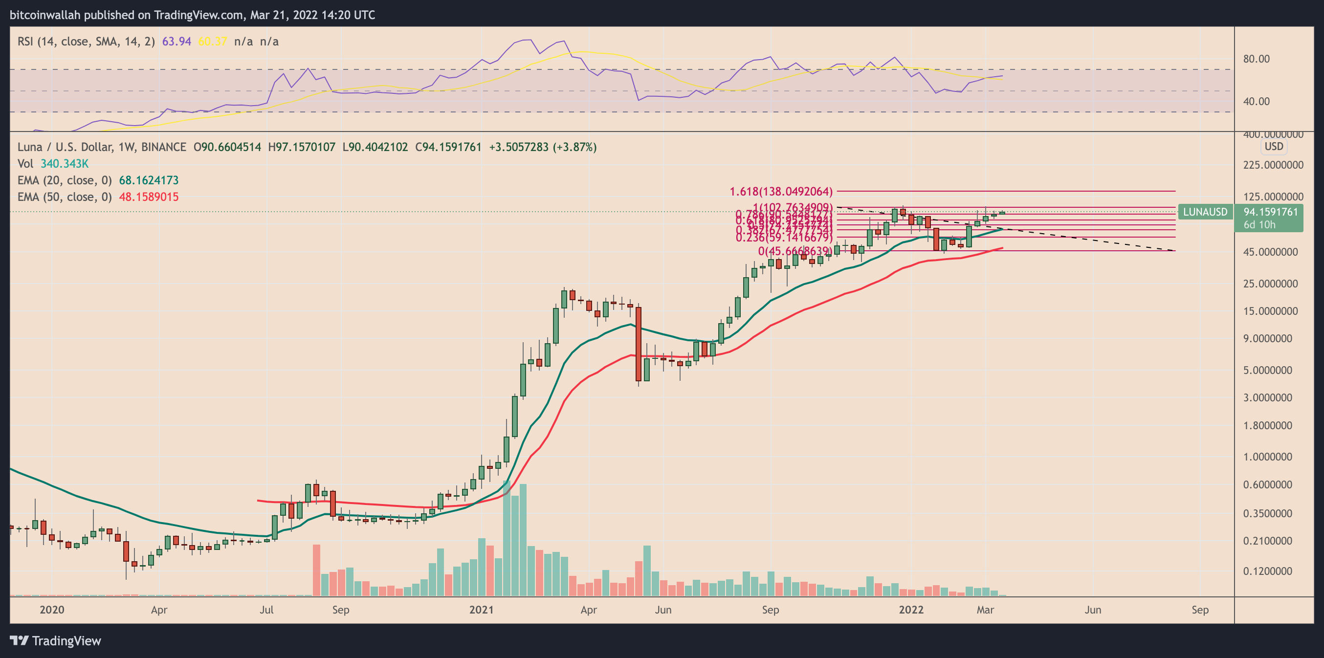 LUNA’s close above its previous record high of around $106 could have it enter unchartered territory with a Fibonacci retracement graph drawn from $102-swing high to $45.50-swing low, suggesting an extended upside move toward $138.
