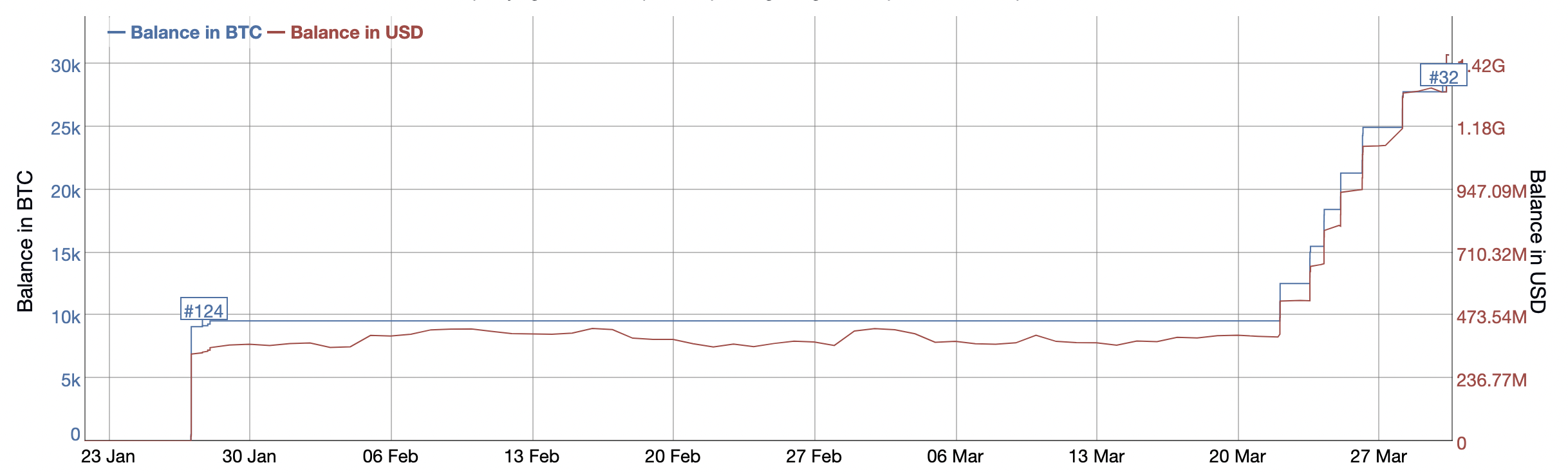 According to the chart, while the wallet first injected almost 10k Bitcoin on 21st Jan, the wallet began stacking sats in earnest on March 22nd. The timing coincides with announcements from the CEO, who stated that “$UST with $10B+ in $BTC reserves will open a new monetary era of the Bitcoin standard.”