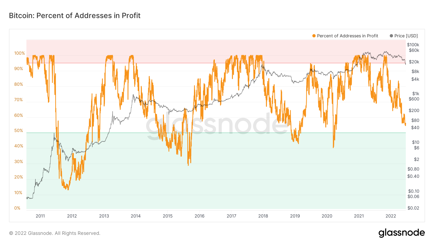 Data from on-chain analytics firm Glassnode confirms that as of June 20, 56.2% of addresses were still worth more in U.S. dollar terms than when their coins entered them.
