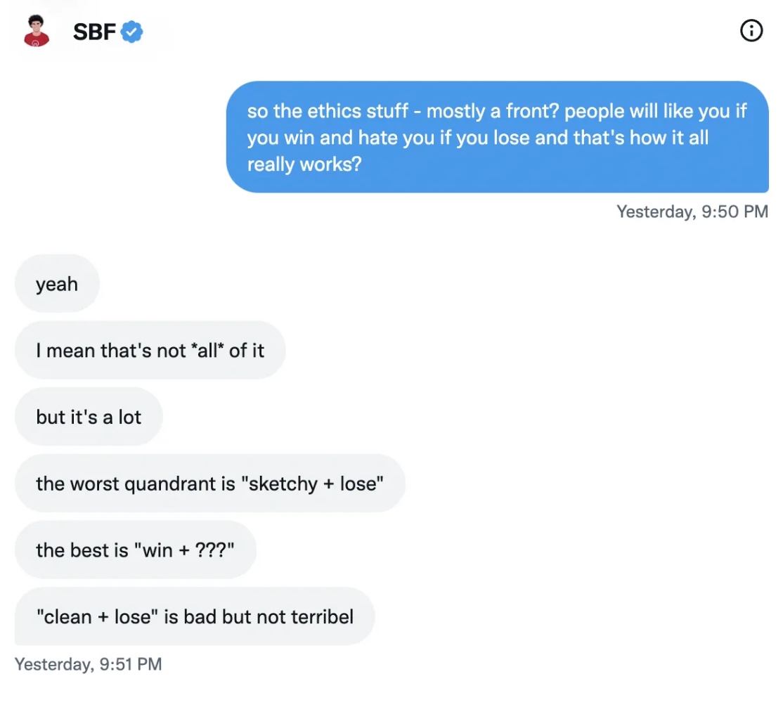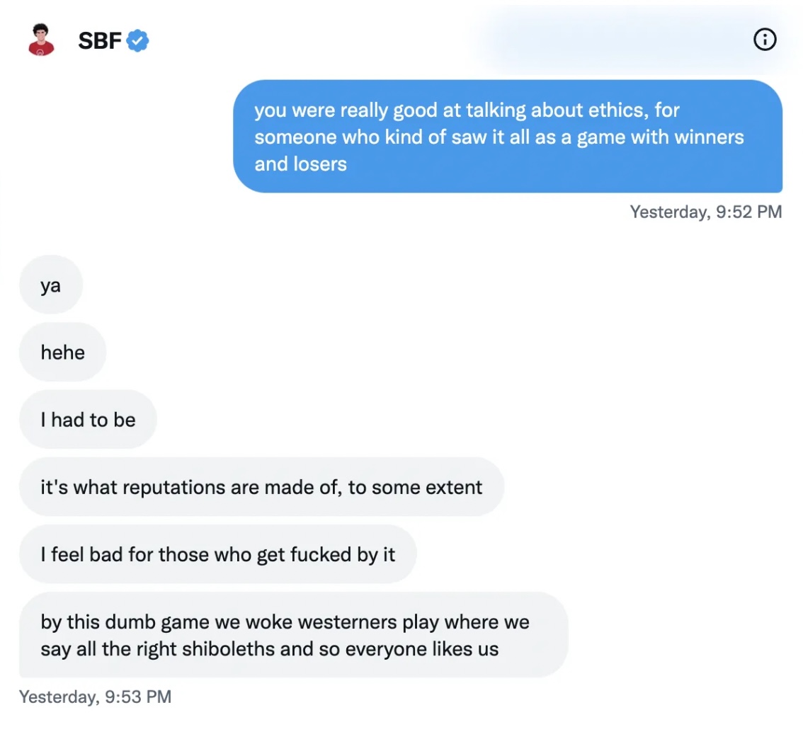 Because Bankman-Fried might have graced the cover of Fortune (then again, so did Elizabeth Holmes), but he proved his worth as an incompetent, incapable leader. He was nothing but a fraud. In a recent tell-all with a Vox reporter on Twitter, he admitted that “the ethics stuff” — read: his beloved philosophy based on philanthropic efforts and effective altruism — was mostly a front, as “it’s what reputations are made of.”