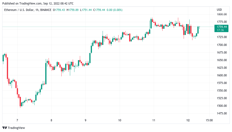 ETH/USD trended down for a second straight day at the time of writing, eyeing $1,760 after hitting local highs of $1,790.