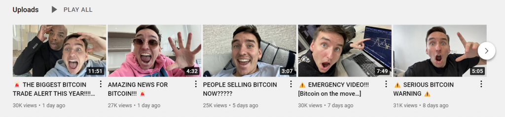 “I don’t like making those thumbnails, but if I don’t, my channel dies,” explains Runefelt, whose YouTube videos feature thumbnails with comically exaggerated, open-mouthed expressions and all-caps titles followed by a half-dozen exclamation or question marks. This approach clearly differentiates him from Nicholas Merten, another Journeys’ crypto YouTube star, who made it clear that “the last thing you’ll find on my channel is me making a shock-face.” This is something Runefelt acknowledges but explains that “the YouTubers getting the most views all use clickbait,” referring to peers such as MMCrypto and BitBoy Crypto.