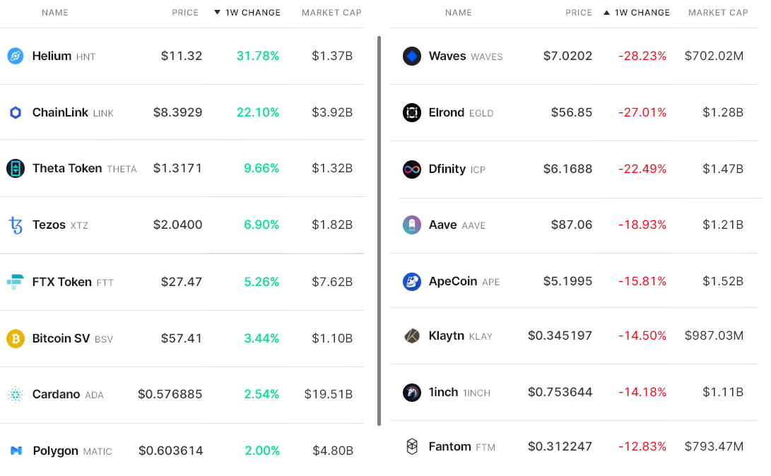 Below are the winners and losers from the past seven days. While the two leading cryptocurrencies presented modest losses, a handful of mid-capitalization altcoins declined by 14% or more.