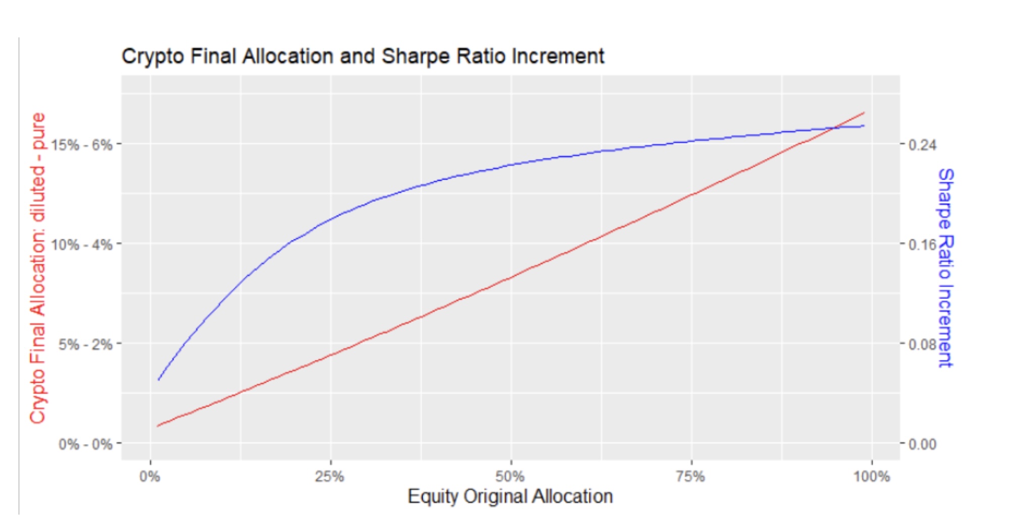 The red line (left axis) shows how much crypto (both diluted and pure) is in the final portfolios. As expected, the more equity in the original portfolio, the more room for crypto. The straight line indicates that there is a linear relationship (technically, an affine relationship once it doesn’t cross the origin) between these two variables, which can be found by a simple regression. The regression reveals that the amount of pure crypto in any given final portfolio is determined by this formula: 0.17% plus 6.40% times the fraction of equities in its respective original portfolio. Although this relationship is based on these specific indices, there are no reasons to expect significantly different behaviors for portfolios with different allocations in equities and bonds, or even for those that also include other asset classes. So, this formula can be viewed as a general rule of thumb for juicing up a portfolio by replacing equities for crypto.