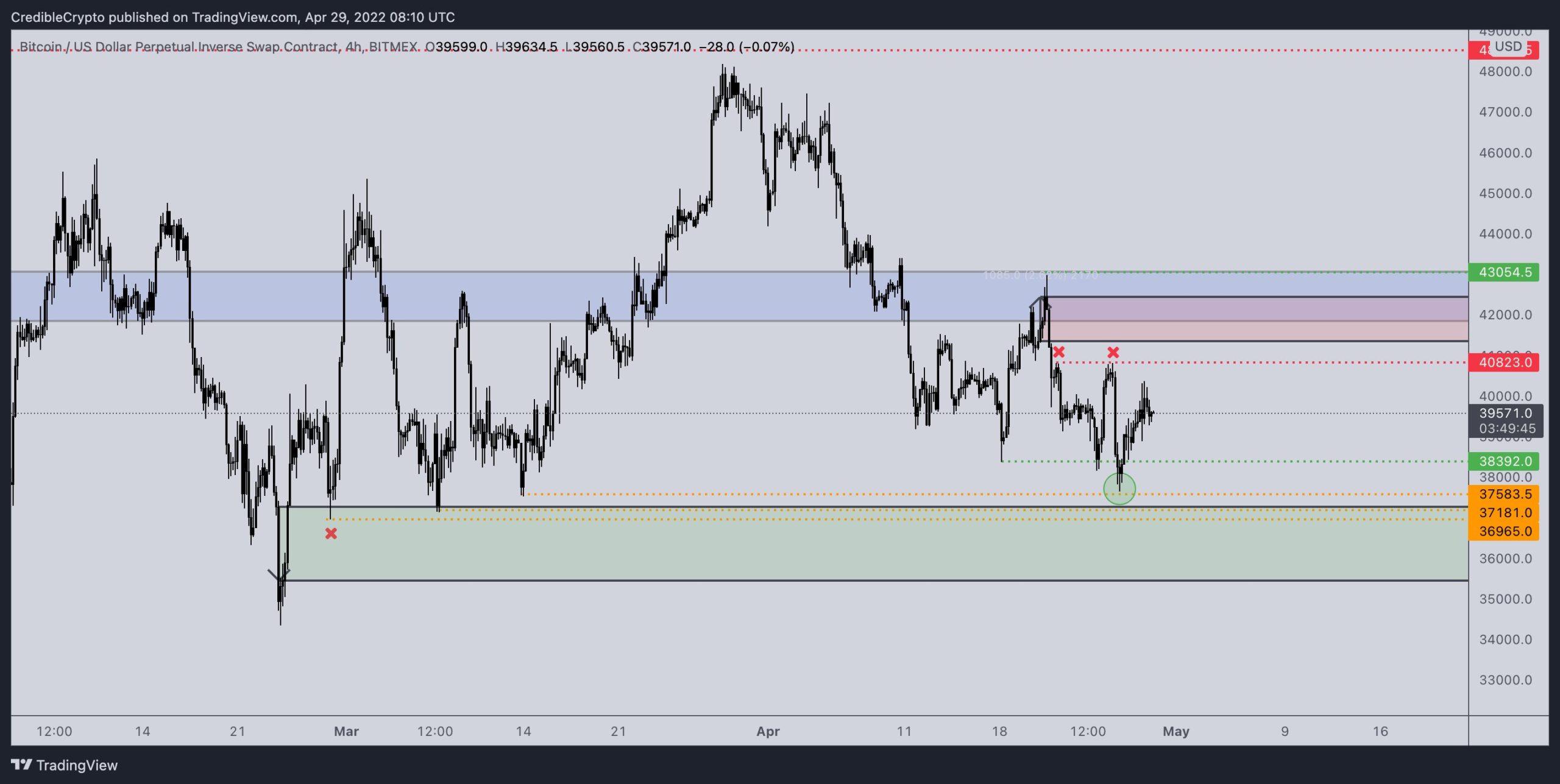 “As per my last update I can see valid arguments for both but give the edge to the bullish scenario due to wave structure. Easy invalidation at 37.7k, if we hit that expect a flush into the orange region and 36k’s.”