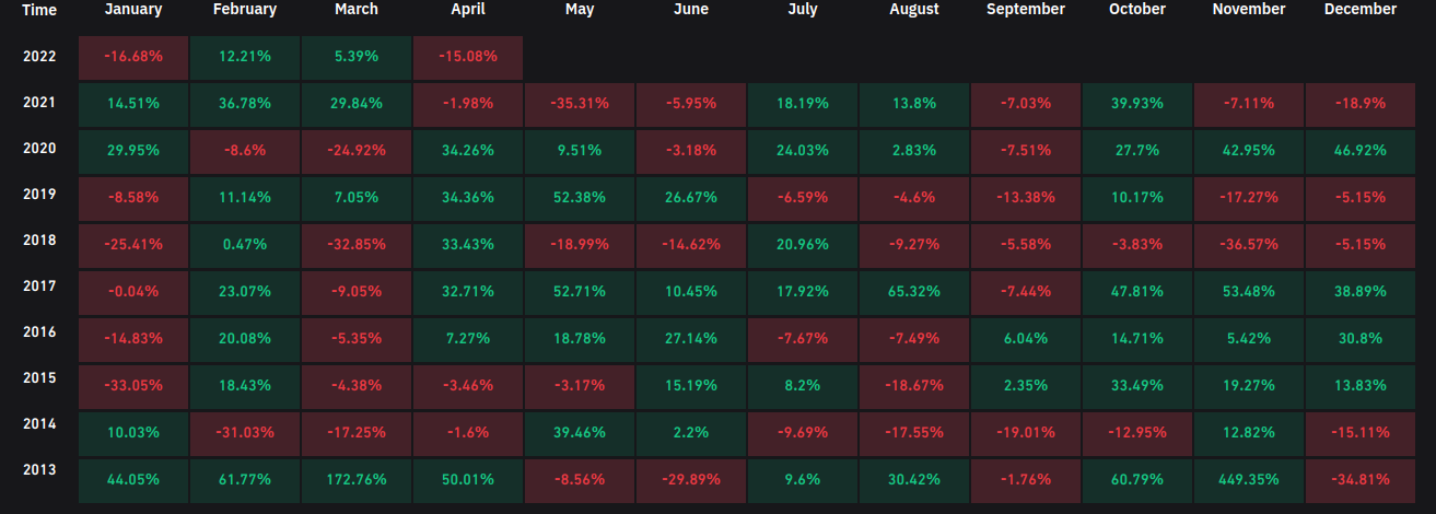 April has so far delivered 15% losses on BTC/USD, the worst month of April in Bitcoin’s history, data from on-chain monitoring resource Coinglass shows.