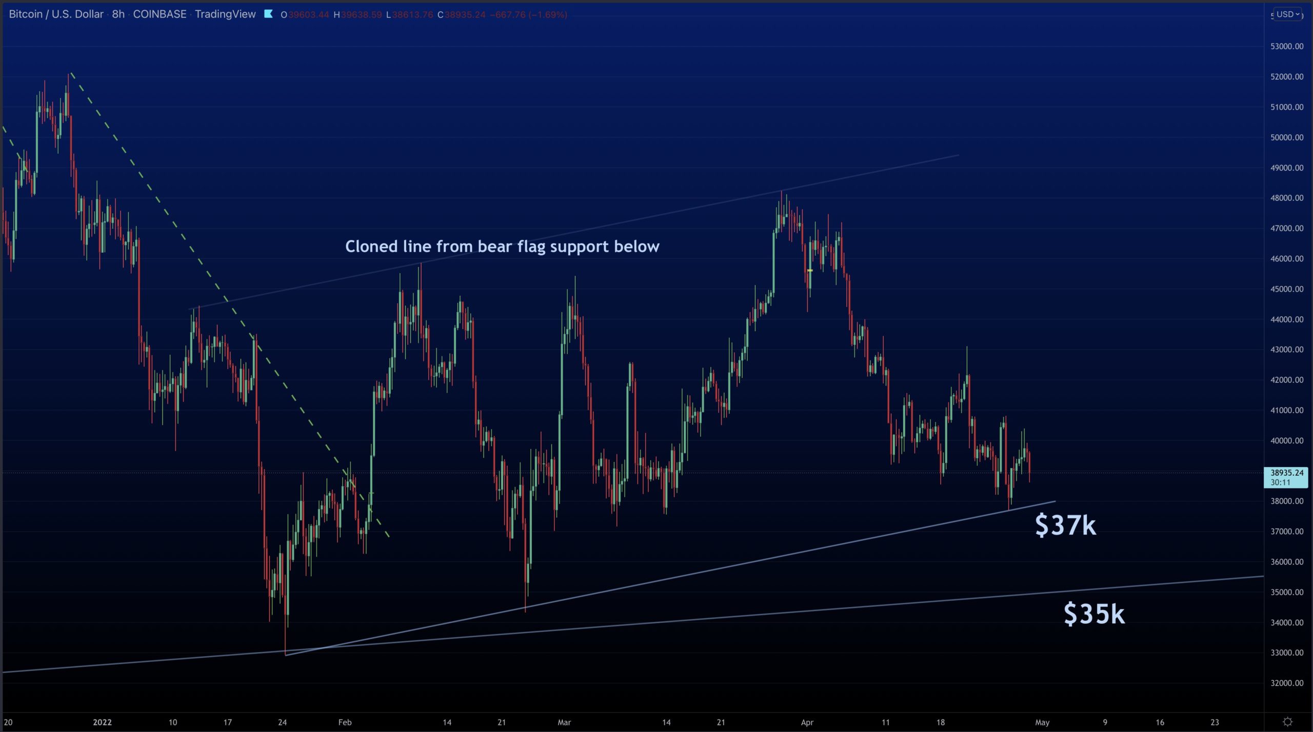 “The only two levels that matter now in Bitcoin. $35k is channel support and below is major technical breakdown. Price is technically bullish since $38k on Feb 4th posted on this account and neutral since $53k breakdown. Everything else has been noise,” he told Twitter followers Friday.