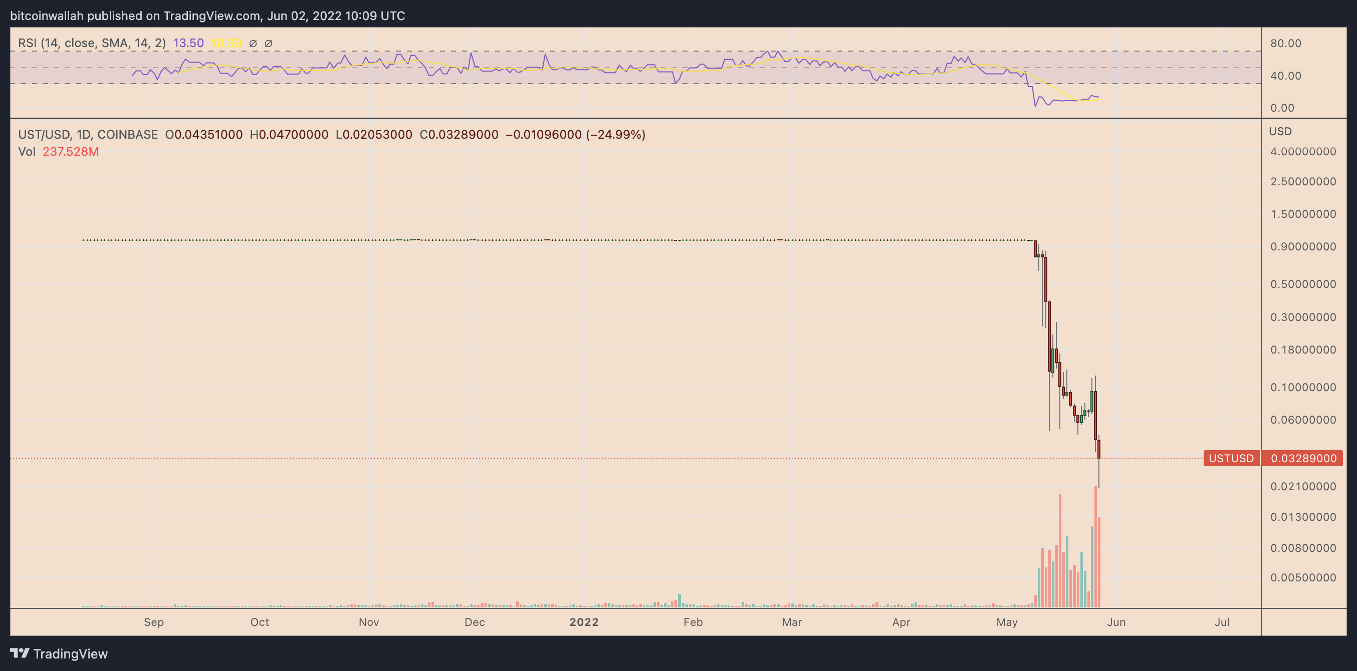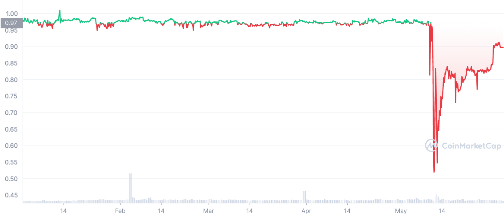In detail, USDX dropped to its lowest level on record—at $0.66—on May 12. The USDX/USD pair has been attempting to reclaim its dollar peg ever since and was changing hands for around $0.89 on June 2, as shown below.
