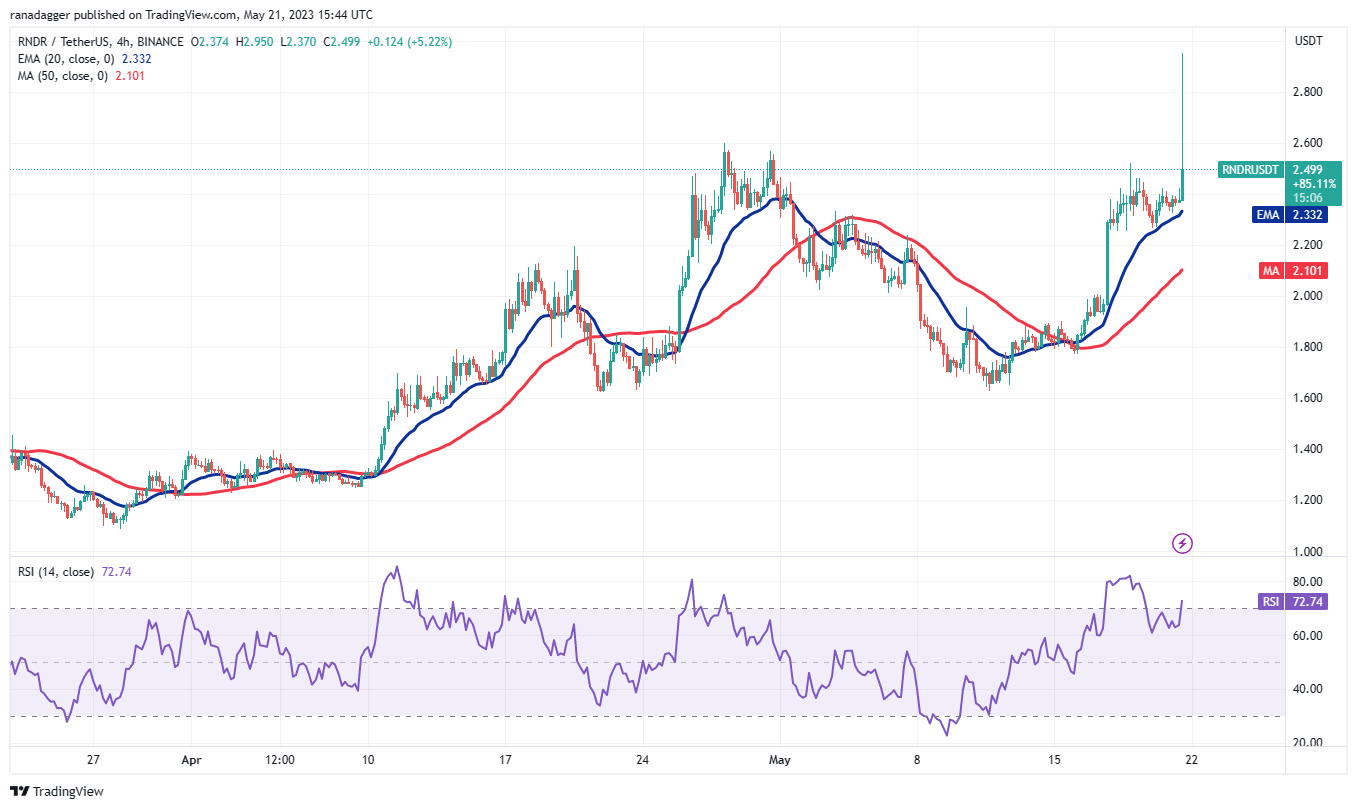 The upsloping moving averages and the RSI just below the overbought area indicate that bulls are in command. Buyers will make another attempt to propel the price above the psychological barrier at $3. If they manage to do that, the RNDR/USDT pair may rally to $3.35.