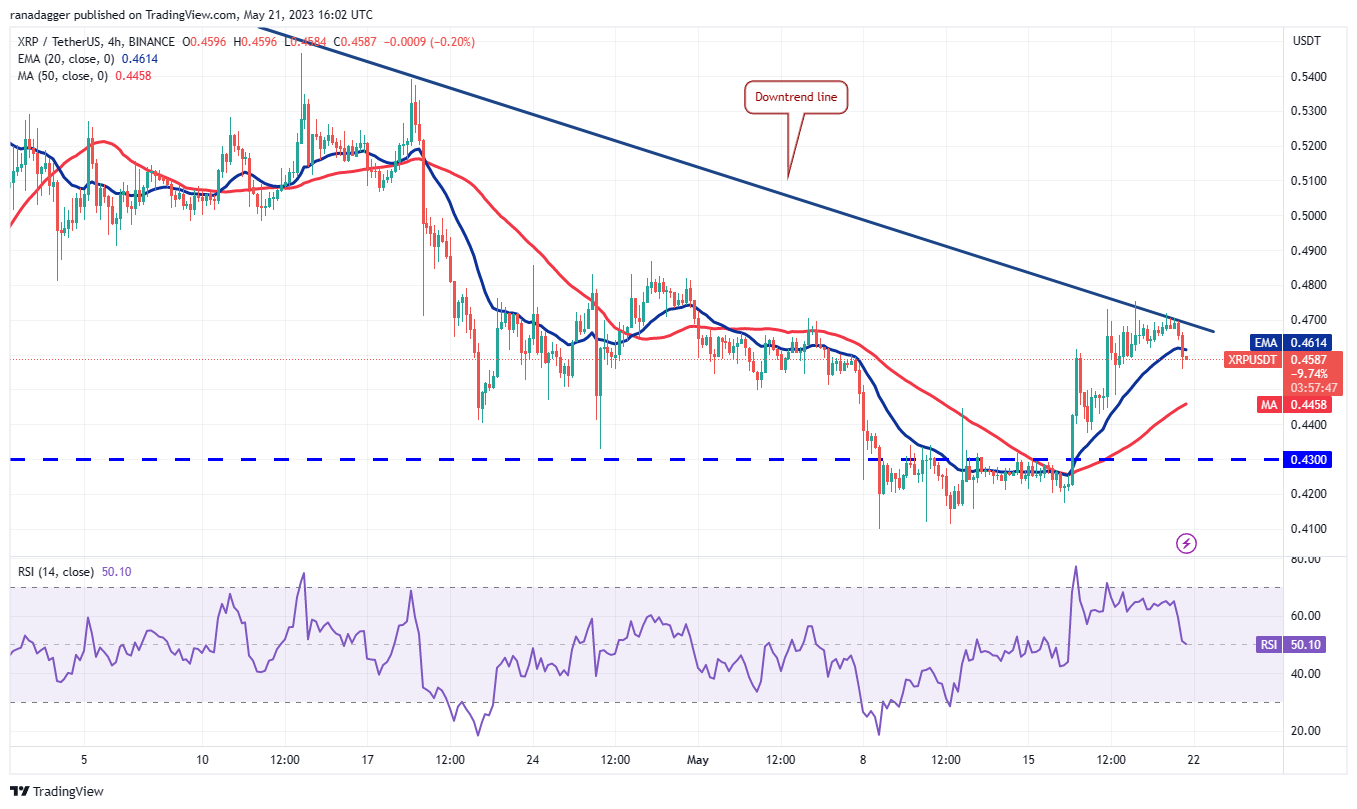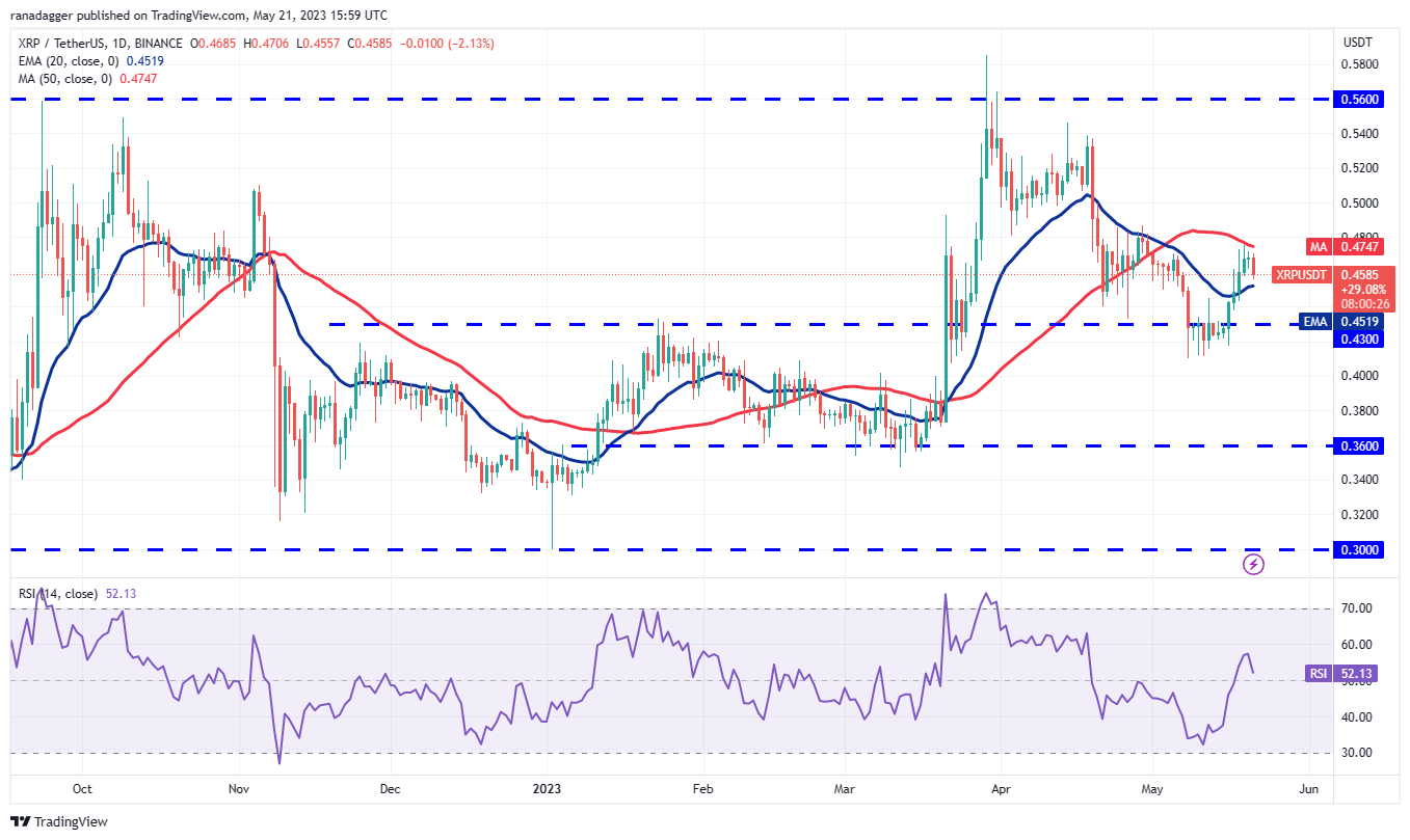 XRP (XRP) is trying to start a recovery. Buyers have been sustaining the price above the 20-day EMA ($0.45) since May 16 but they haven’t been able to overcome the obstacle at the 50-day SMA ($0.47).