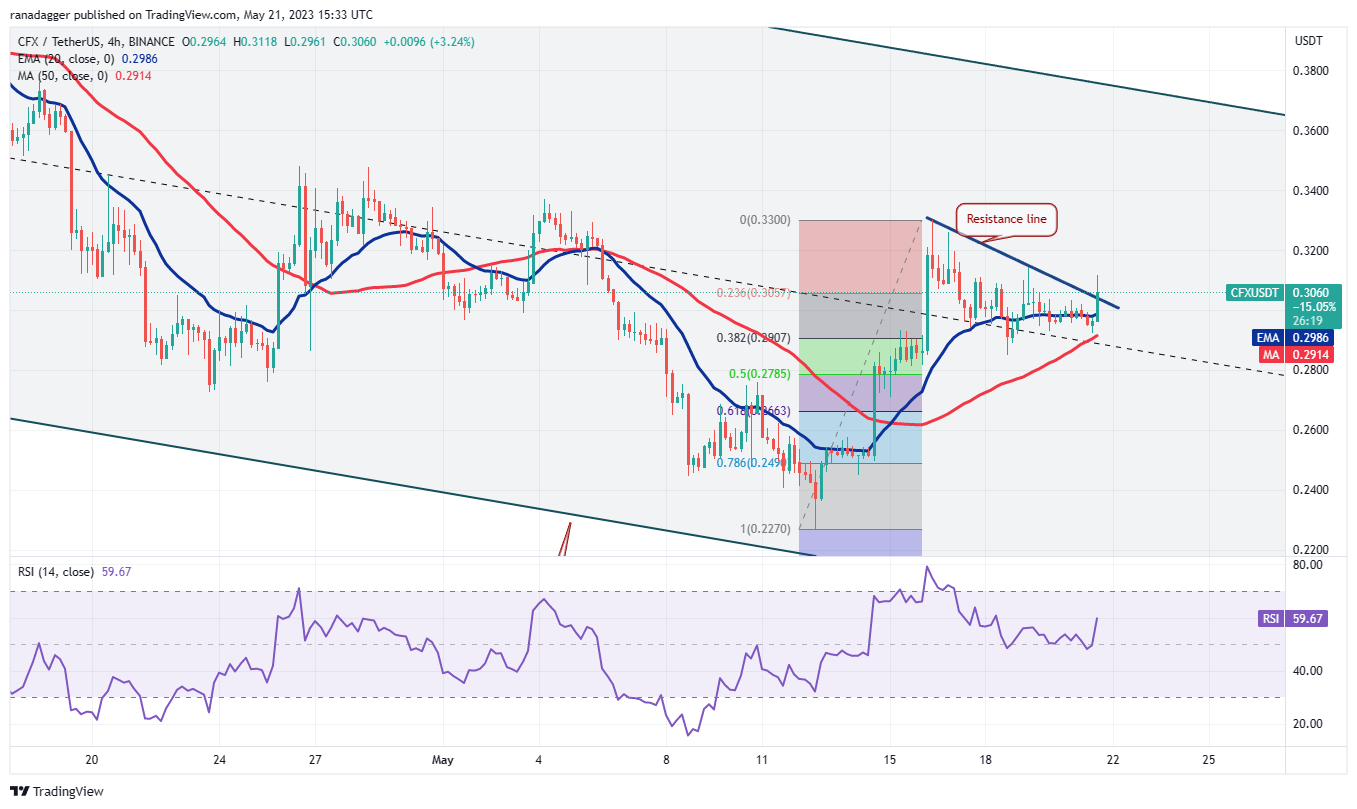 Conflux (CFX) is trading inside a descending channel pattern. The bulls purchased the dip to the support line on May 12, indicating solid demand at lower levels.