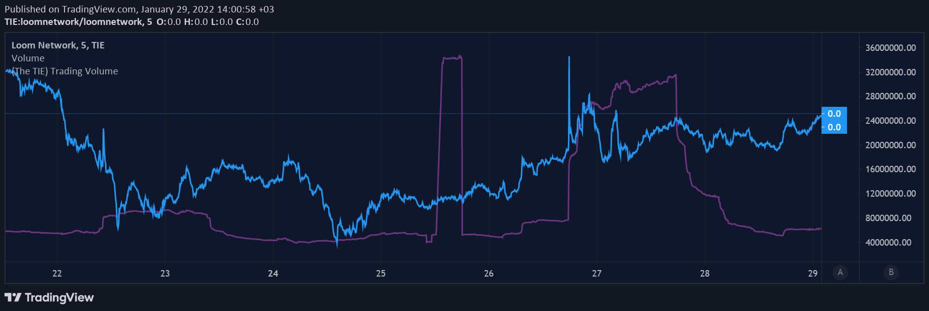 In the case of Oxygen (OXY), starting from the Jan. 24 afternoon, both the price and the trading volume lines embarked on upside trajectories, moving up beside each other. A peak trading volume of around $3.8 million, registered on Jan. 26, marked a 421% week-to-week increase. A weekly price peak near $0.49 followed in 12 hours.