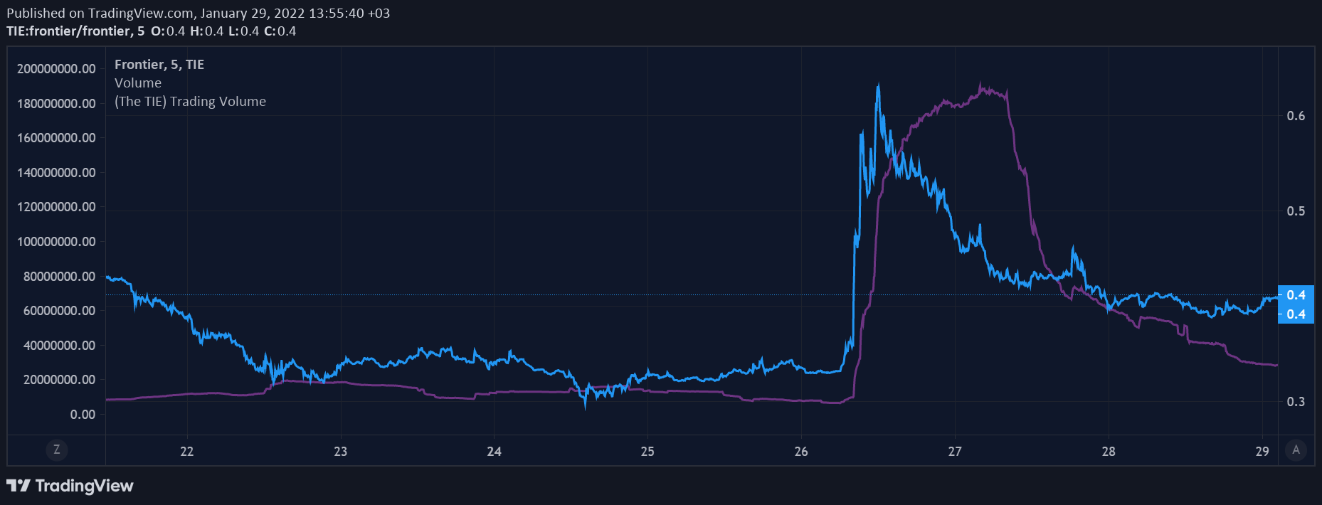 FRONT, a token representing DeFi aggregator Frontier, topped the chart of last week’s trading volume movers chart with a 3041% increase on the heels of its listing on the Korean crypto exchange Bithumb. As evident in the graph, the Jan. 26 listing announcement had first triggered a price spike as the coin’s value almost doubled, soaring from $0.41 to $0.78 in less than 6 hours. FRONT’s trading volume followed the price dynamics closely, peaking the day after the announcement.