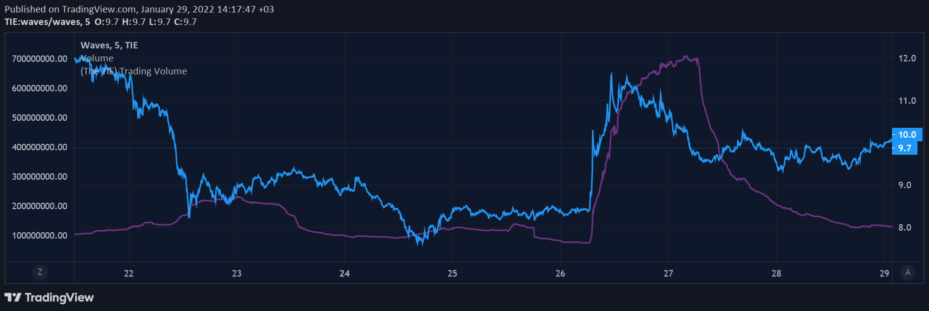 At the height of its trading volume momentum that came on Jan. 27, WAVES registered an 860% increase compared to the week before. The volume pump followed a sharp price increase as the token shot up from $8.39 to $11.38 in about 5 hours. Trader activity remained high even as the price began to correct.