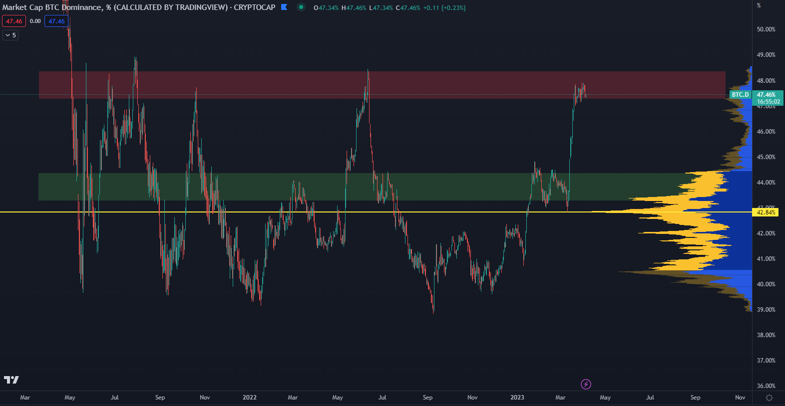 Ako vidíme na grafe podľa TradingView, dominancia BTC narazila na rezistenciu v oblasti 48 % a pod týmto pásmom sa nachádza už 2 roky. Je preto pravdepodobné, že k podobnému scenáru dôjde aj teraz. Viac sa o analýze dominancie môžete dočítať v článku Čaká nás altcoinová sezóna? Rast dominancie bitcoinu čoskoro skončí.