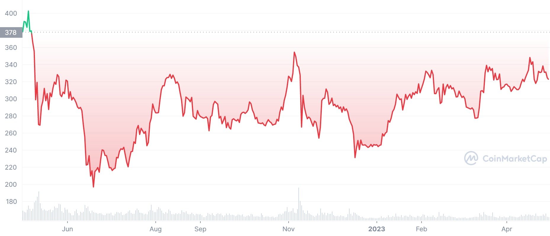 Cena sa posledný rok pohybuje na 300 dolároch. Aj napriek klesajúcemu trendu na trhu a tlaku regulačných úradov v USA, sa drží na stabilnej cene. V bull markete môžeme očakávať, že cena vyrastie minimálne na historické maximum, čo by bol 100 % nárast. Väčší rast nie len na BNB, ale celom kryptomenovom trhu, môžeme očakávať po bitcoinovom halvingu, ktorý bude v máji 2024.