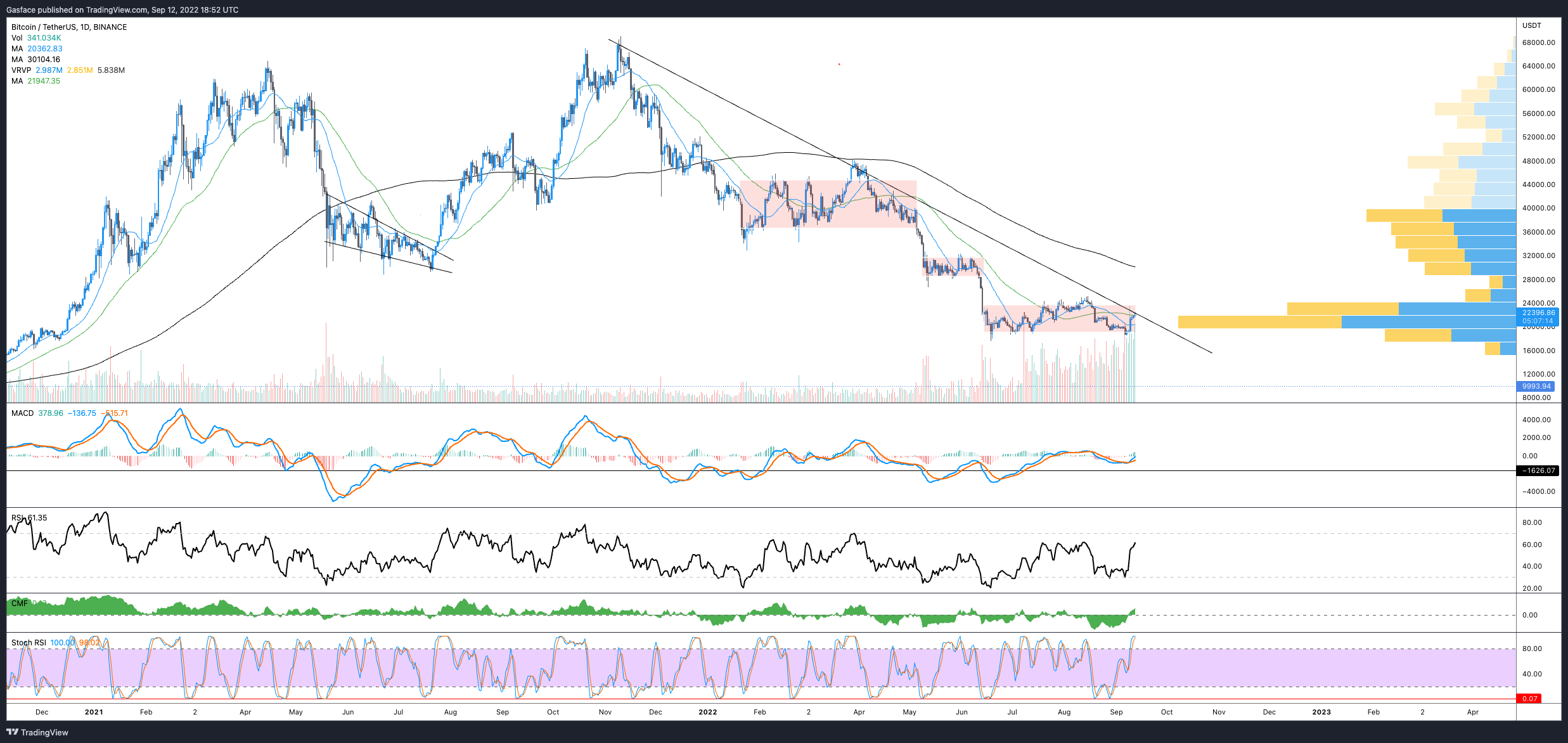 https://images.cointelegraph.com/images/840_aHR0cHM6Ly9zMy5jb2ludGVsZWdyYXBoLmNvbS91cGxvYWRzLzIwMjItMDkvZTFlYjE1MjQtZDliNi00YzMxLWIwN2YtMGJmY2RiZTIzNTllLmpwZw==.jpgOn Sept. 12, Bitcoin is doing Bitcoin things as usual. Since Sept. 9 the price has broken out nicely, booking a near 16% gain and rallying into the long-term descending trendline which appears to have resistance at $23,000.