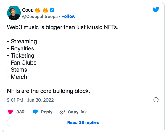 The Promised Land may still be some way — with no easy path to get there. It would require music rights to be stored on-chain and royalties to be paid on-chain, both of which are technologically possible but don’t seem to be an immediate priority of anyone in the traditional industry.
