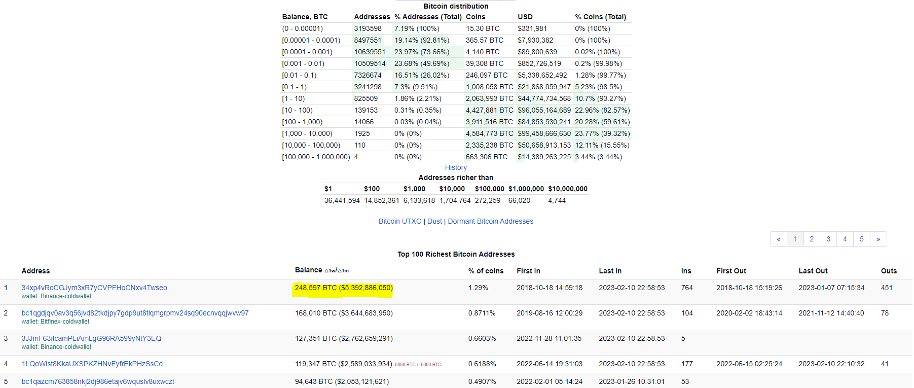 Peňaženka, ktorá má najviac BTC je vlastnená spoločnosťou Binance a obsahuje v čase písania článku až 248 597 mincí, čo predstavuje hodnotu 5 392 886 050 dolárov. Hneď po nej nasleduje peňaženka Bitfinex s počtom mincí 168 010 BTC a treticu uzatvára opäť Binance s peňaženkou, na ktorej má uložených 127 351 mincí.