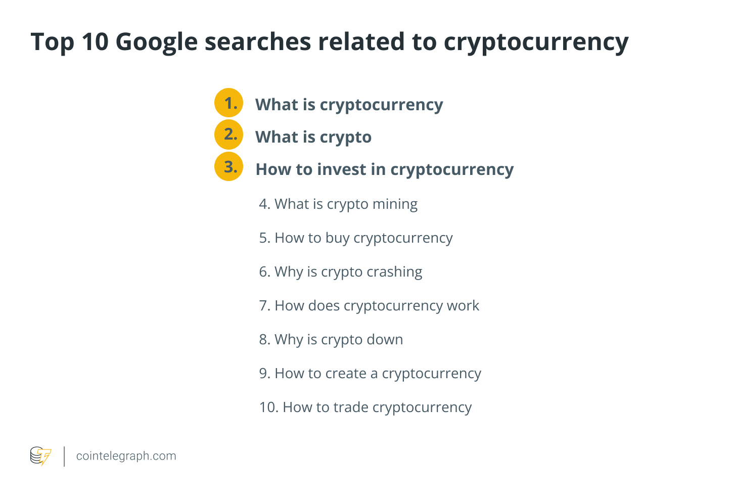 The top 10 Google searches related to cryptocurrencies uncover an increase in curiosity among general investors — represented by two ‘Whys,’ three ‘What’s’ and five ‘How’s.’ Let’s go through the most crypto-related Google searches, from highest to lowest.