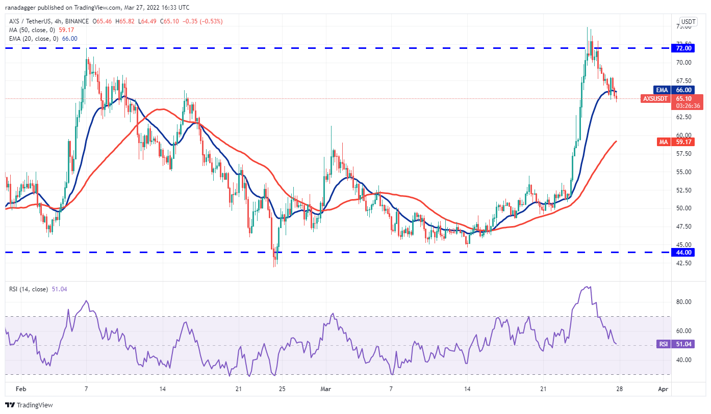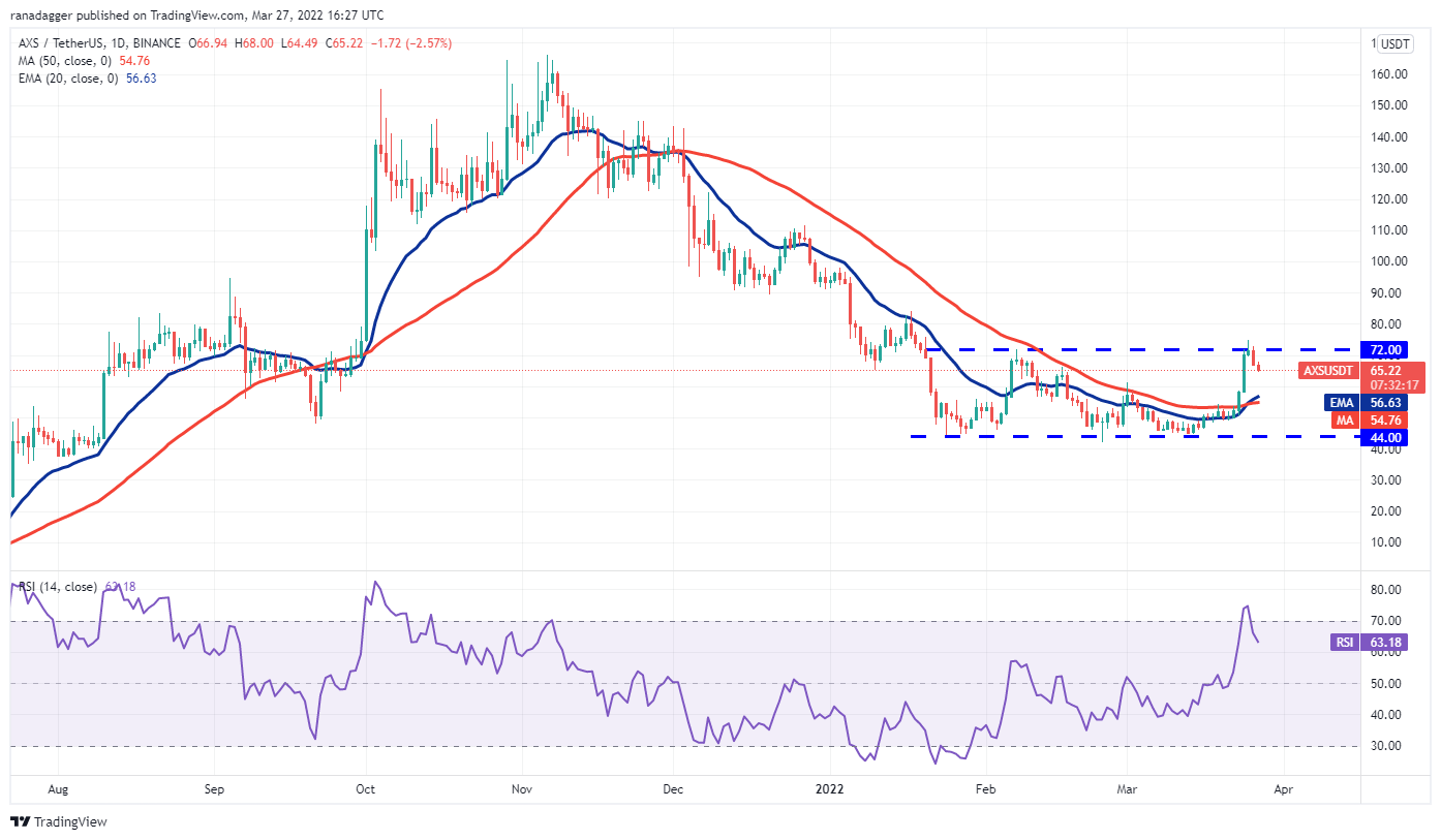 Axie Infinity (AXS) has been trading between $72 and $44 for the past few days. The buyers pushed the price above the overhead resistance on March 25 but could not sustain the higher levels. This indicates that the bears are defending the level with vigor.