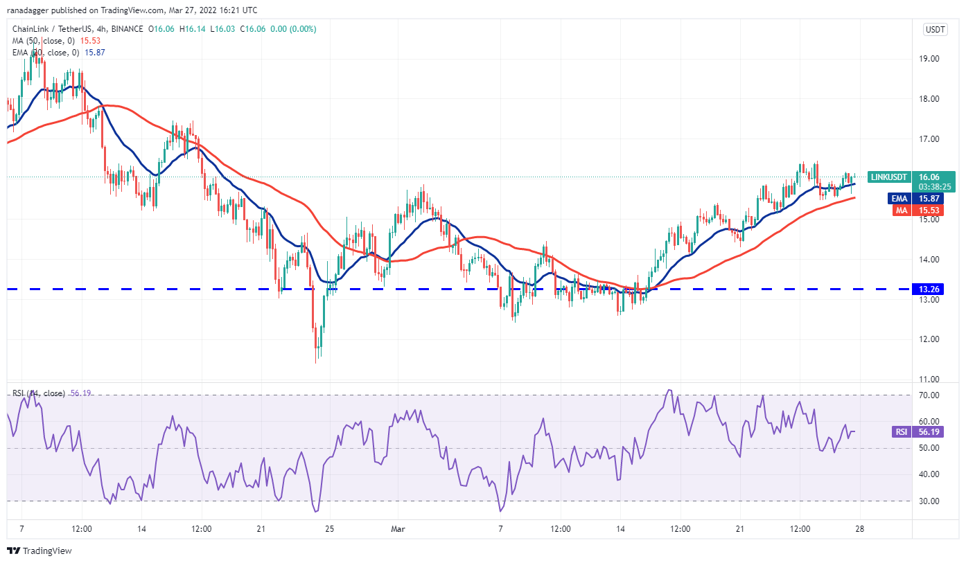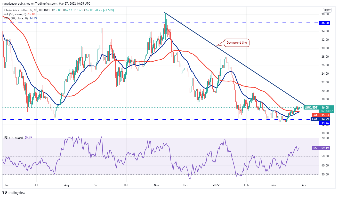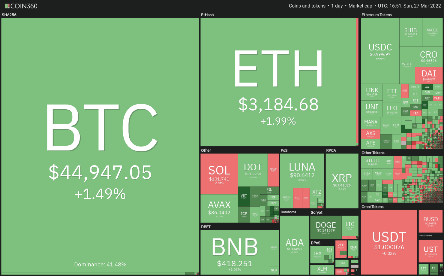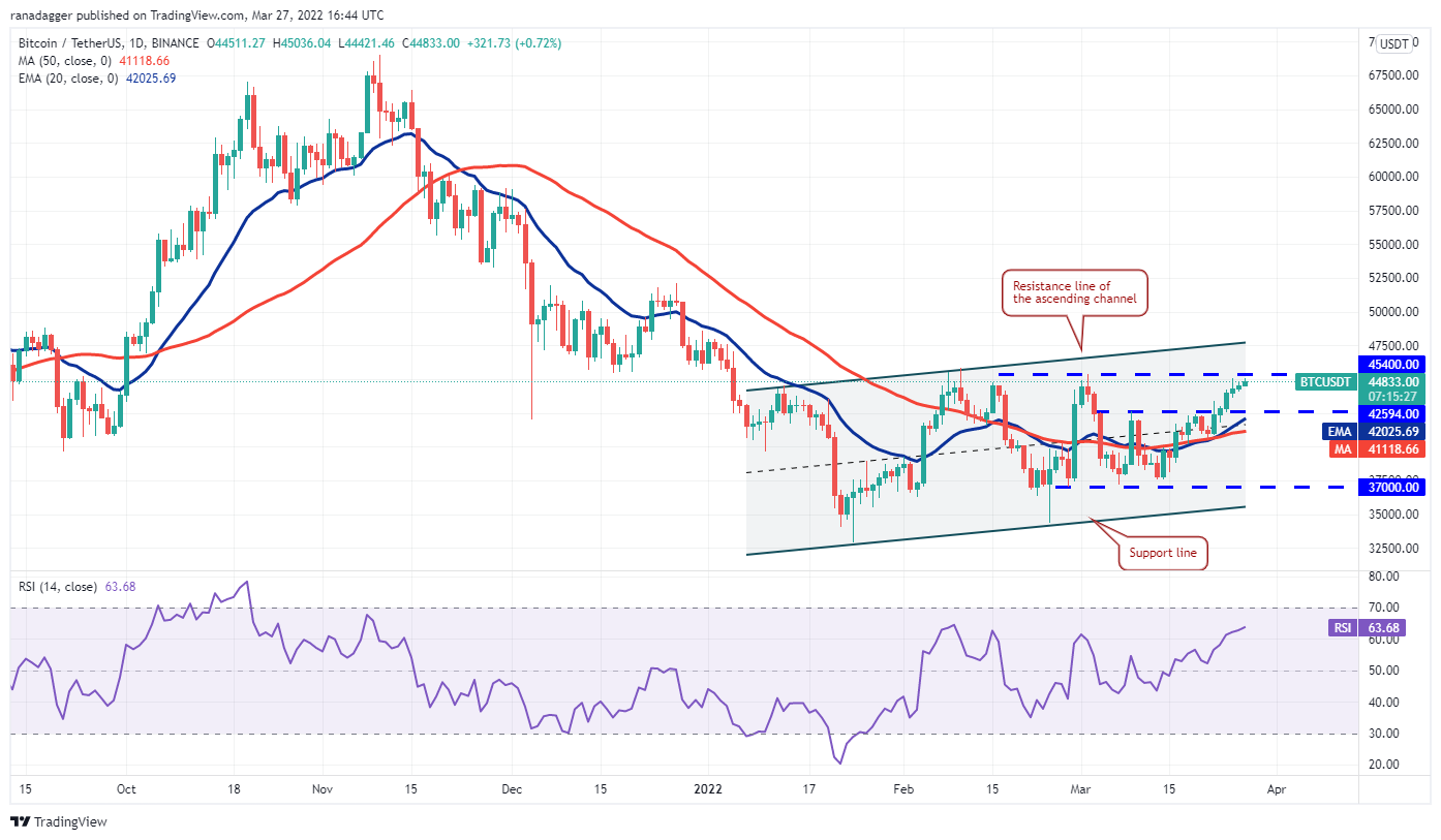 The long wick on Bitcoin’s March 25 candlestick shows that the bears are defending the overhead resistance at $45,400. A minor positive is that the bulls have not given up much ground, suggesting that the traders are not closing their positions in a hurry.