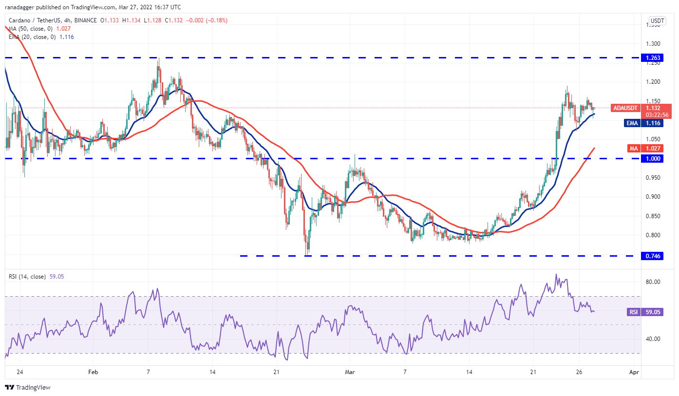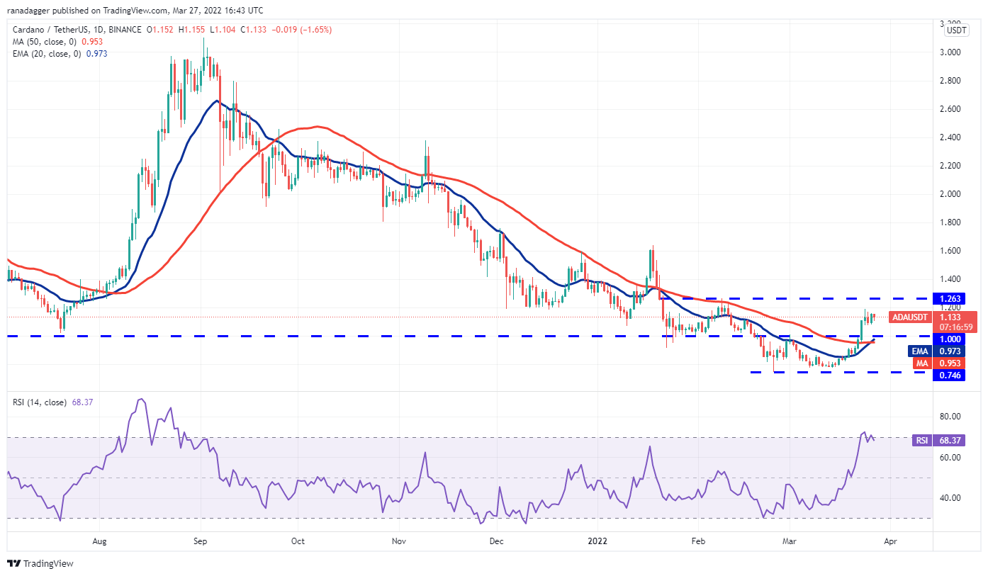 The moving averages have completed a bullish crossover and the RSI is in the positive zone, indicating that bulls have the upper hand. If buyers push and sustain the price above $1.26, the bullish momentum may pick up and the ADA/USDT pair could rally to the next critical resistance at $1.60.