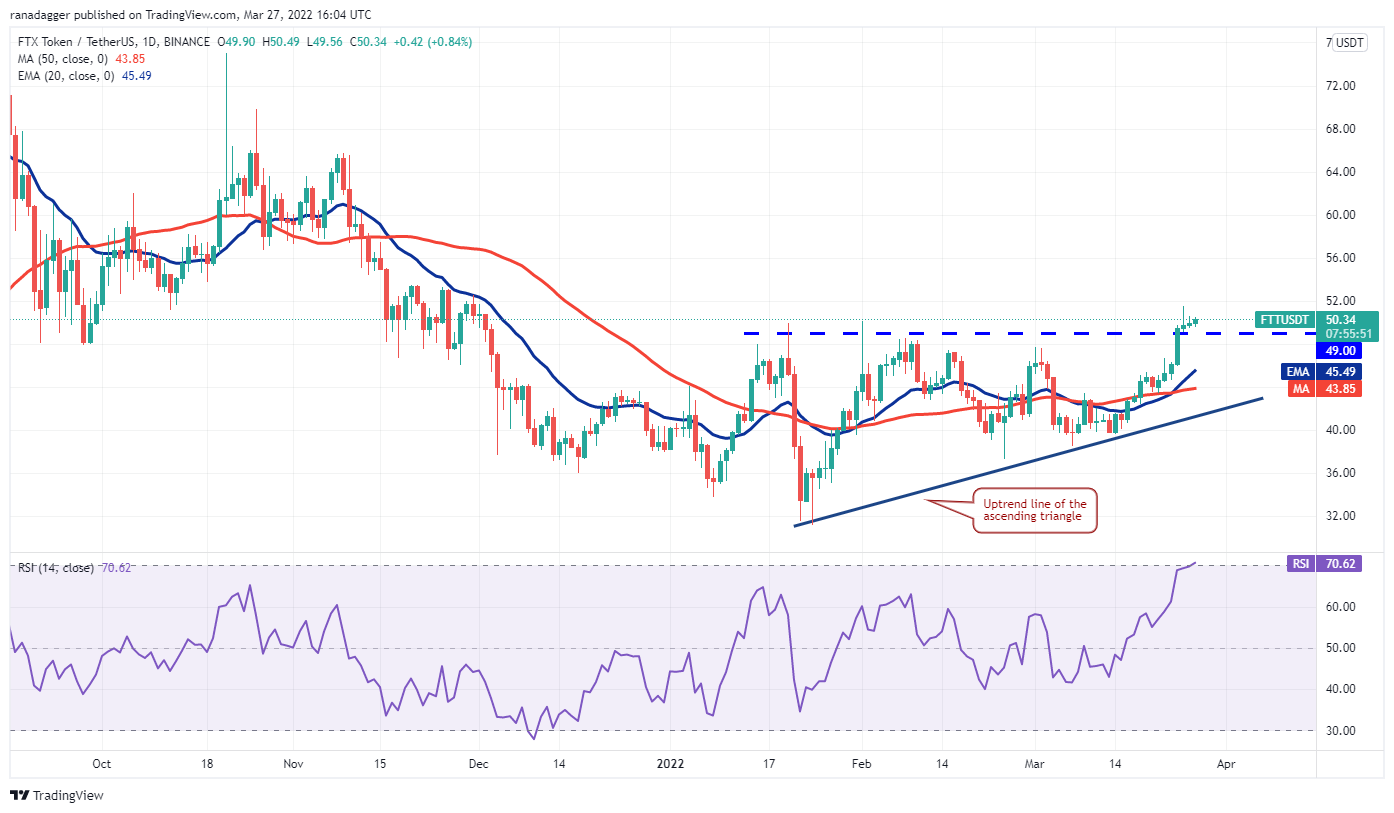 FTX Token (FTT) broke and closed above $49 on March 24, completing an ascending triangle pattern. Although buyers pushed the price above the psychological resistance at $50 on March 25, they could not sustain the higher levels.