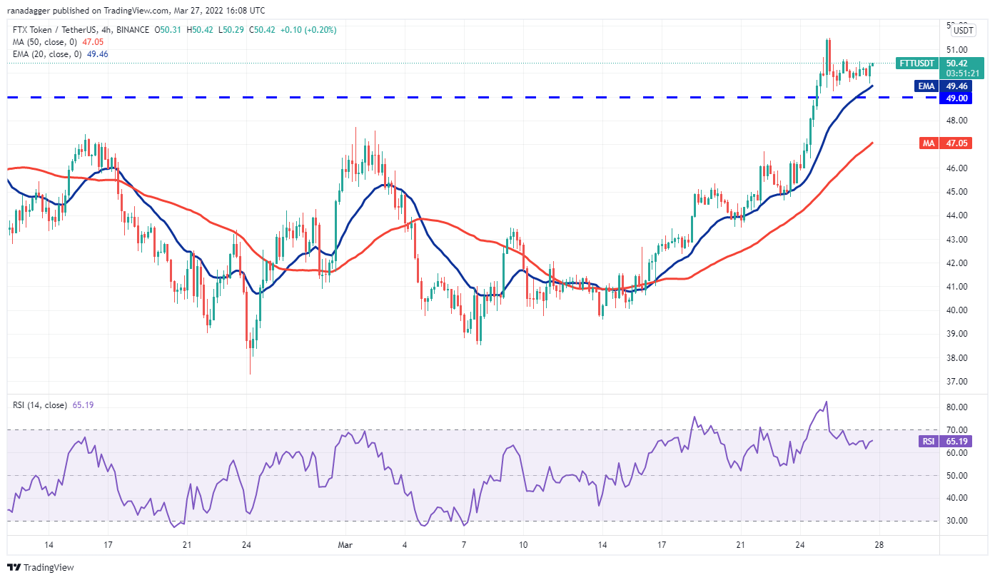 This suggests that the bears have not yet given up and they continue to sell at higher levels. The bears will now try to pull and sustain the price back below $49. If they manage to do that, the aggressive bulls who purchased the breakout from the triangle may get trapped. This could sink the FTT/USDT pair to the 20-day EMA ($45).