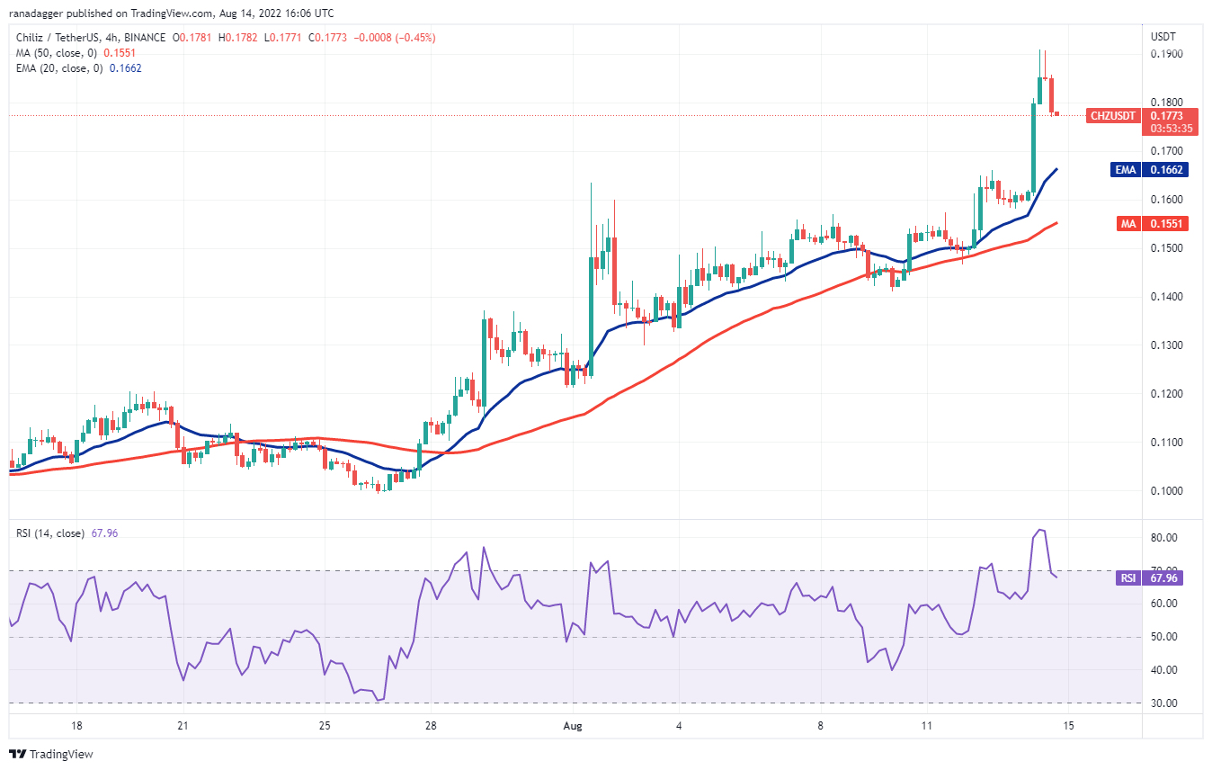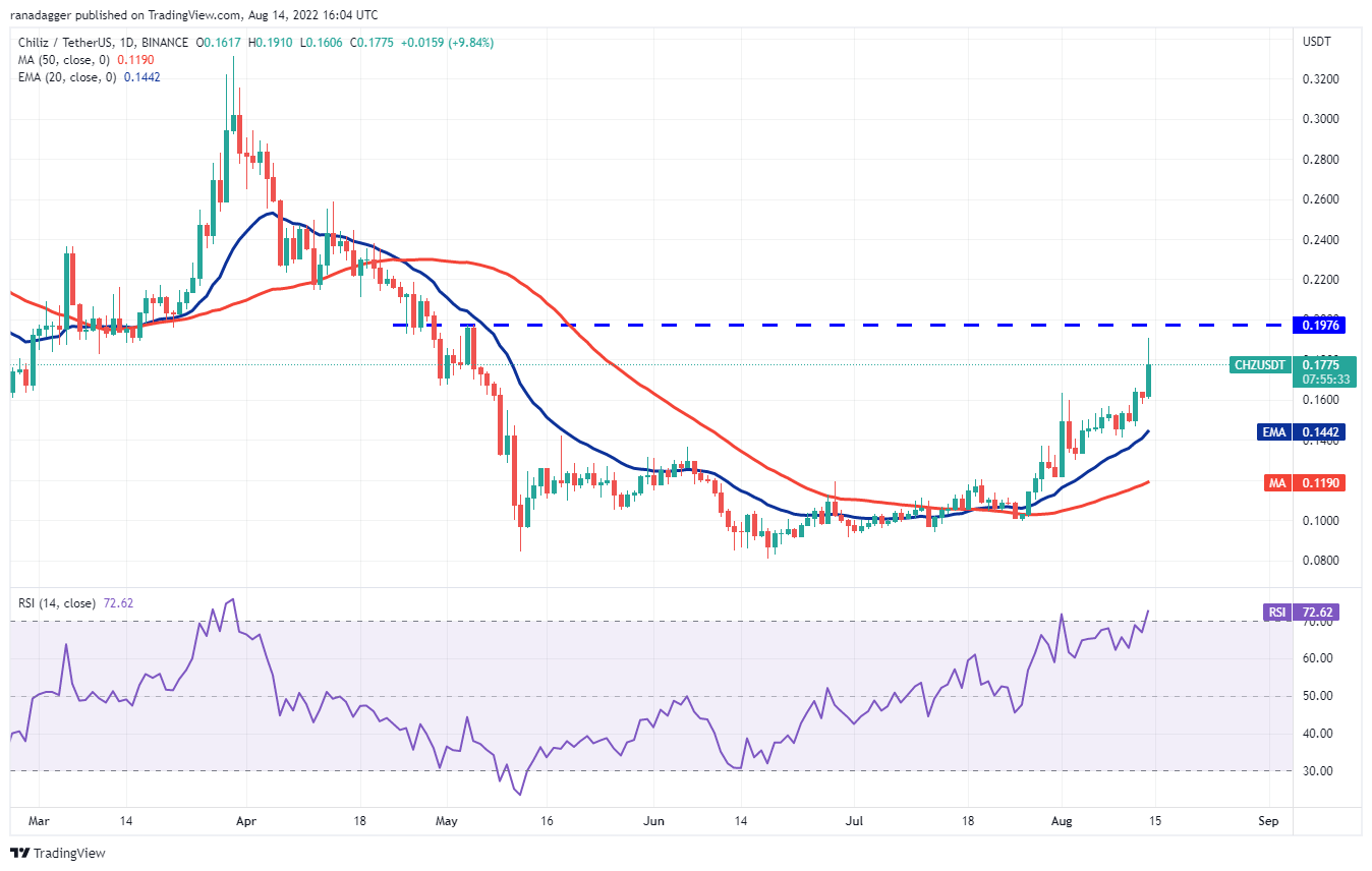 Chiliz (CHZ) has been in a strong recovery for the past few days but the long wick on the Aug. 14 candlestick suggests that bears are defending the overhead resistance at $0.19.