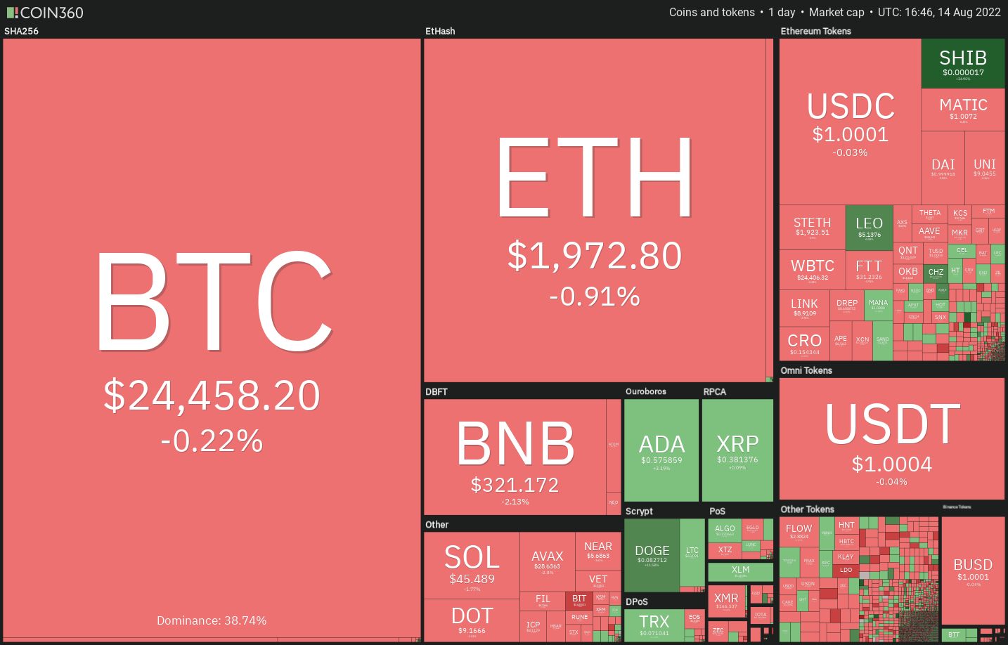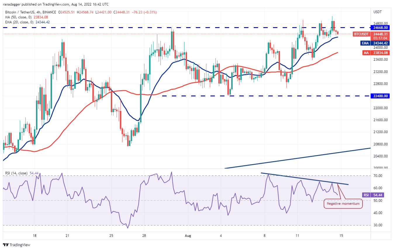 Bitcoin rose above the overhead resistance of $24,668 on Aug. 13 and Aug. 14 but the bulls could not sustain the higher levels. This indicates that bears are selling on rallies but repeated breach of an overhead resistance tends to weaken it.