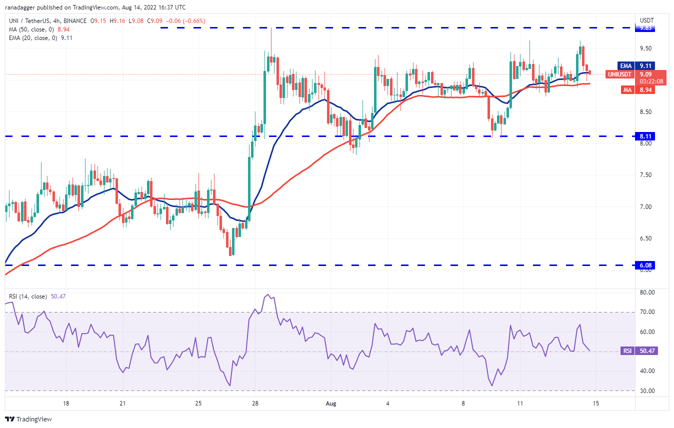 Uniswap (UNI) has been consolidating between $8.11 and $9.83 for the past few days. This suggests that the bulls are buying the dips but the bears are defending the overhead resistance.
