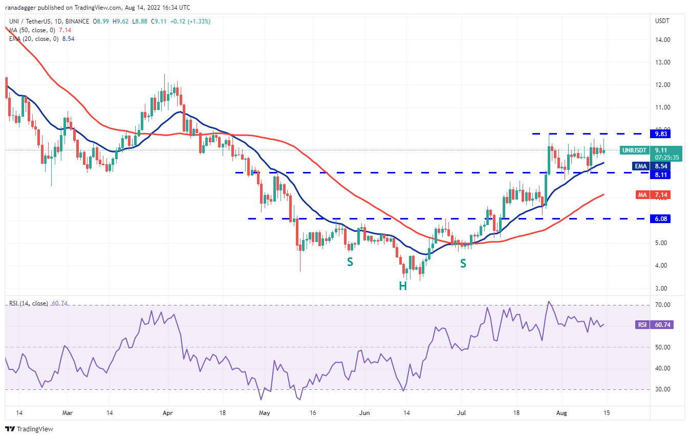 The longer the price remains in the range, the stronger will be the breakout from it. The 20-day EMA ($8.54) is sloping up and the RSI is in the positive territory, indicating advantage to buyers. If bulls thrust the price above $9.83, the UNI/USDT pair could pick up momentum and rally toward $10.55 and later to $12.