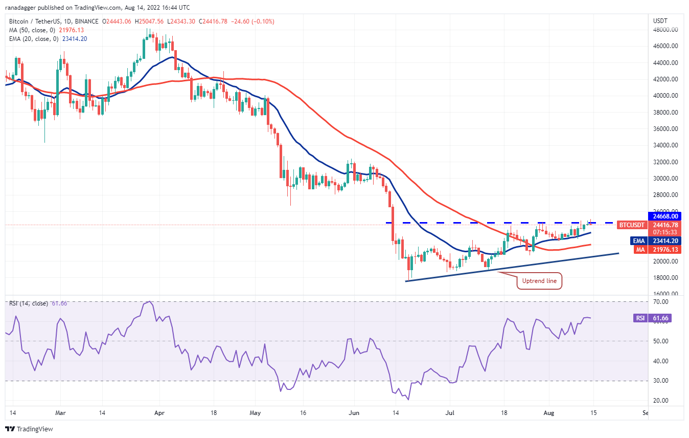 The gradually upsloping 20-day exponential moving average ($23,414) and the relative strength index (RSI) in the positive territory indicate that the path of least resistance is to the upside. If bulls sustain the price above $25,000, the momentum could pick up further and the BTC/USDT pair could rally to $28,000.