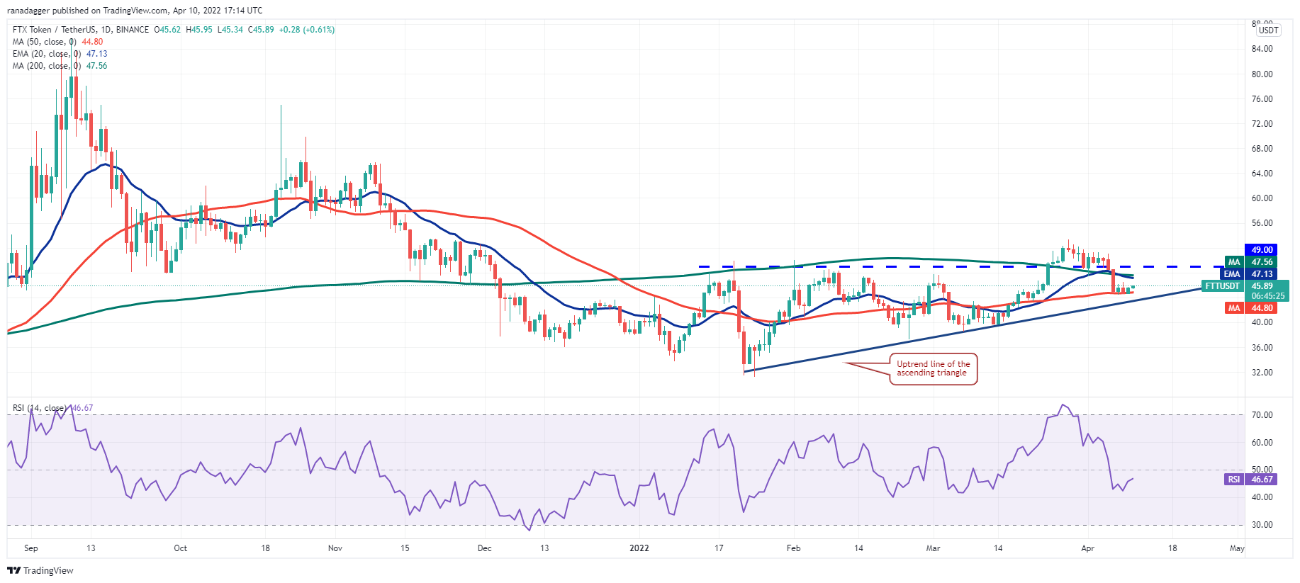 FTX Token (FTT) broke and closed above $49 on March 24 but the bulls could not flip the level into support during the retest. The price slipped below the 200-day SMA ($47) and has reached the 50-day SMA ($45).