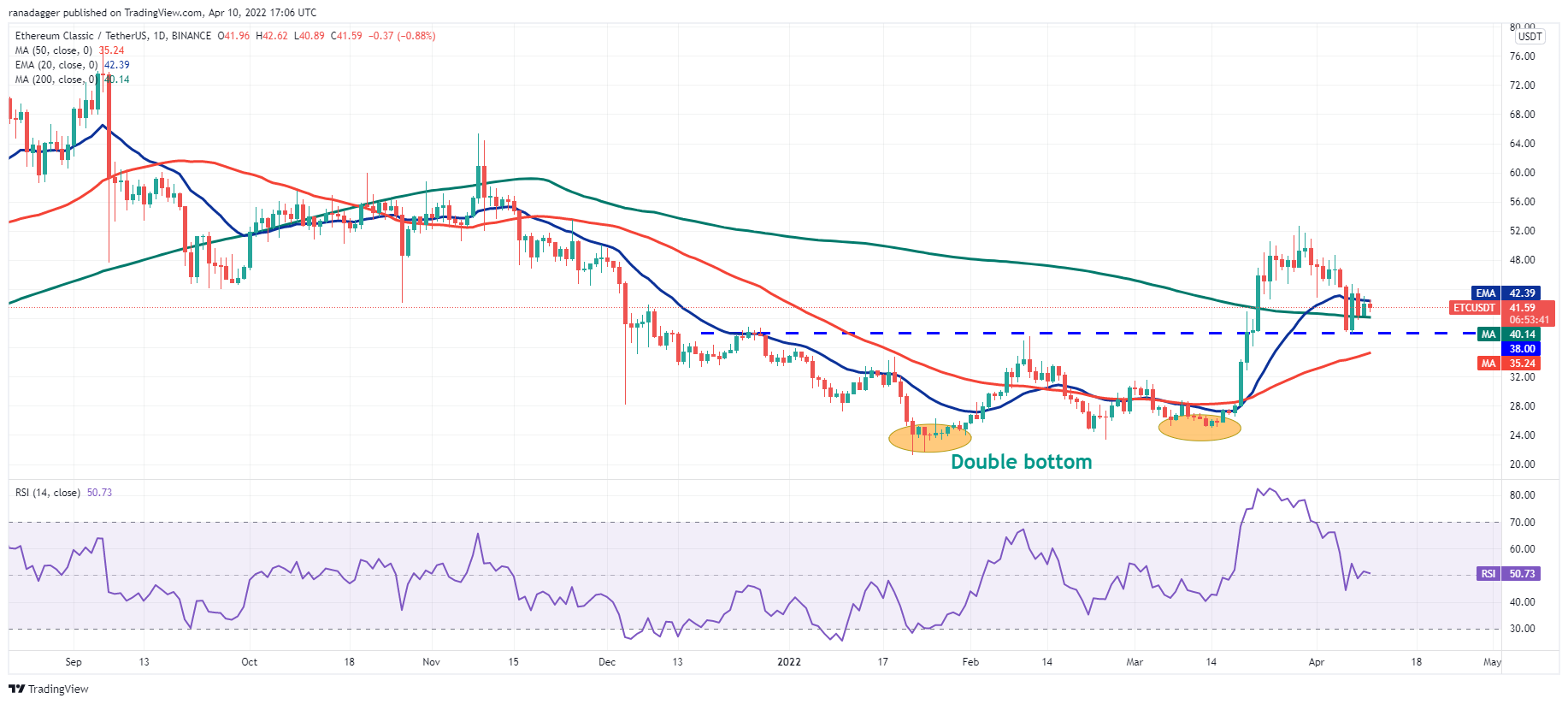 Ethereum Classic (ETC) formed a double bottom pattern when it broke and closed above the overhead resistance at $38. The price then rallied to the pattern target at $52 on March 29 where profit-booking set in. This pulled the price to the breakout level at $38.