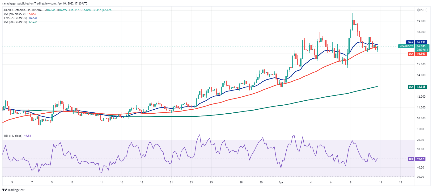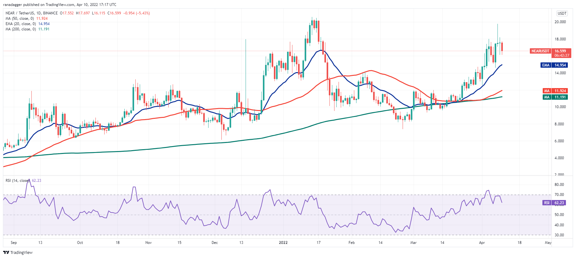 Near Protocol (NEAR) turned down sharply from the stiff overhead resistance at $20 on April 8 and the long wick on the day’s candlestick suggests that bears are aggressively defending the overhead resistance.