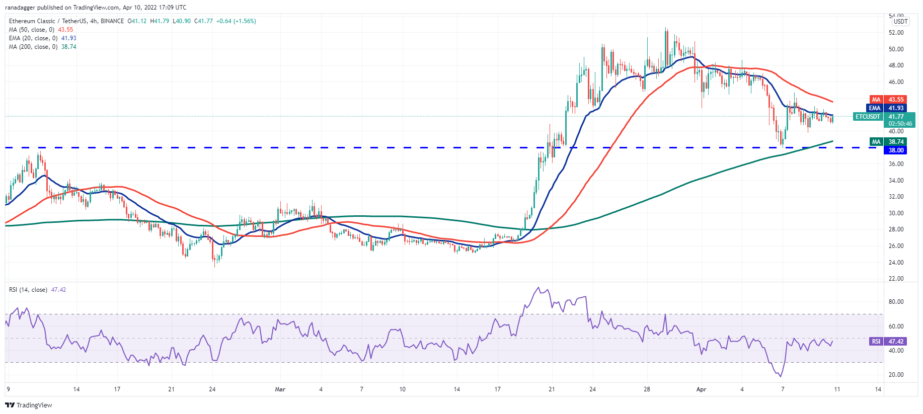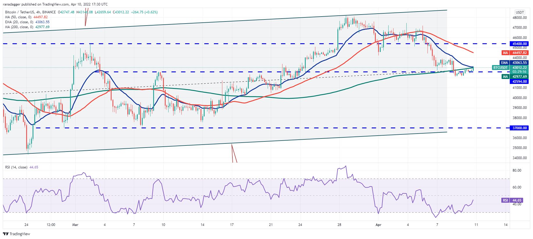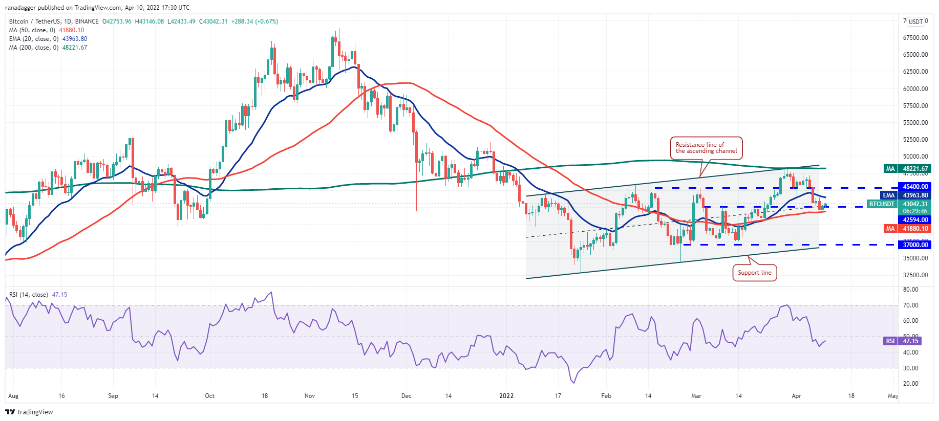 A minor positive is that the bulls are attempting to defend the 50-day simple moving average ($42,620). If bulls push and sustain the price above the 20-day exponential moving average ($43,923), it will increase the possibility of range-bound action in the short term. The BTC/USDT pair may then oscillate between the 50-day SMA and the 200-day SMA ($48,219) for a few days.