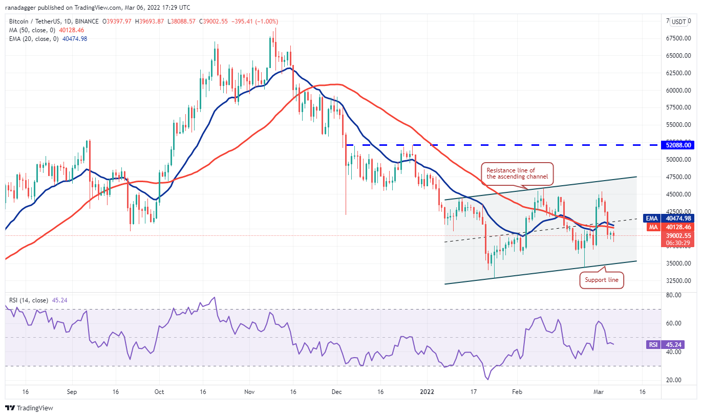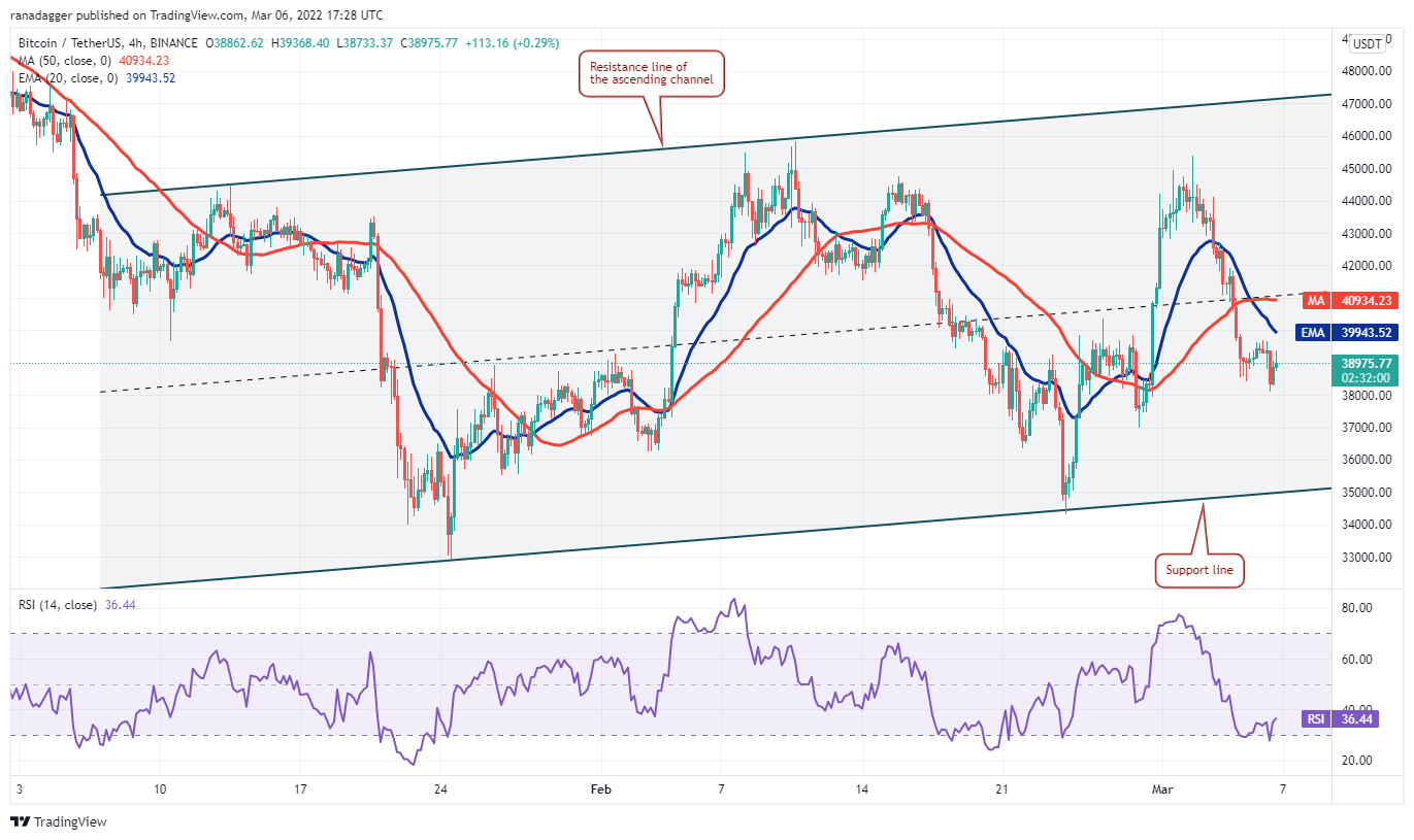 This short-term bearish view will invalidate if the price turns up from the current level and breaks above the 20-day exponential moving average ($40,474). That will indicate strong buying at lower levels. The bulls will then attempt to push the price toward the resistance line of the channel. The next trending move is likely to begin after the pair breaks above or below the channel.