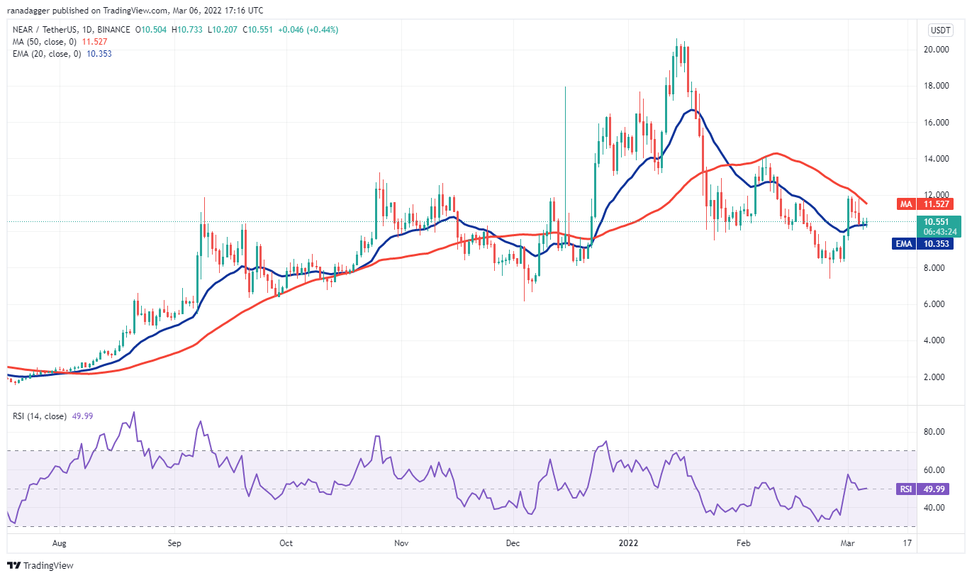 NEAR Protocol (NEAR) is sandwiched between the moving averages for the past few days. This shows that bears are selling on rallies to the 50-day SMA ($11) while bulls are buying on dips to the 20-day EMA ($10).
