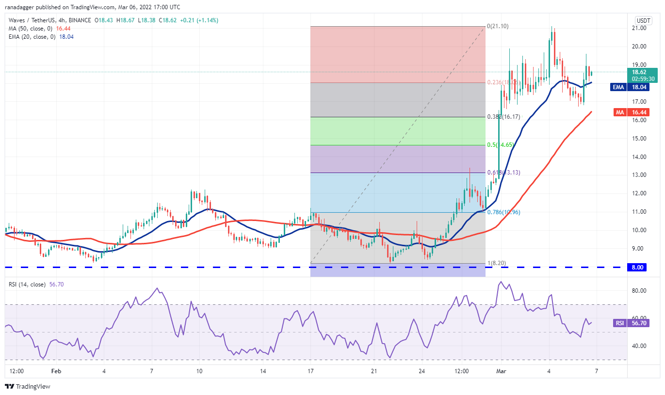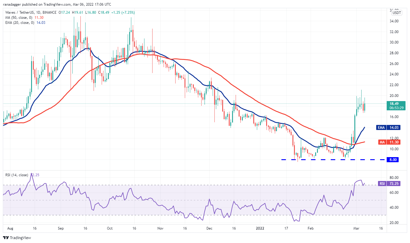 Waves (WAVES) formed a double bottom pattern at $8 and rallied sharply to $21. The moving averages have completed a bullish crossover and the RSI is in the overbought zone, indicating that bulls have the upper hand.