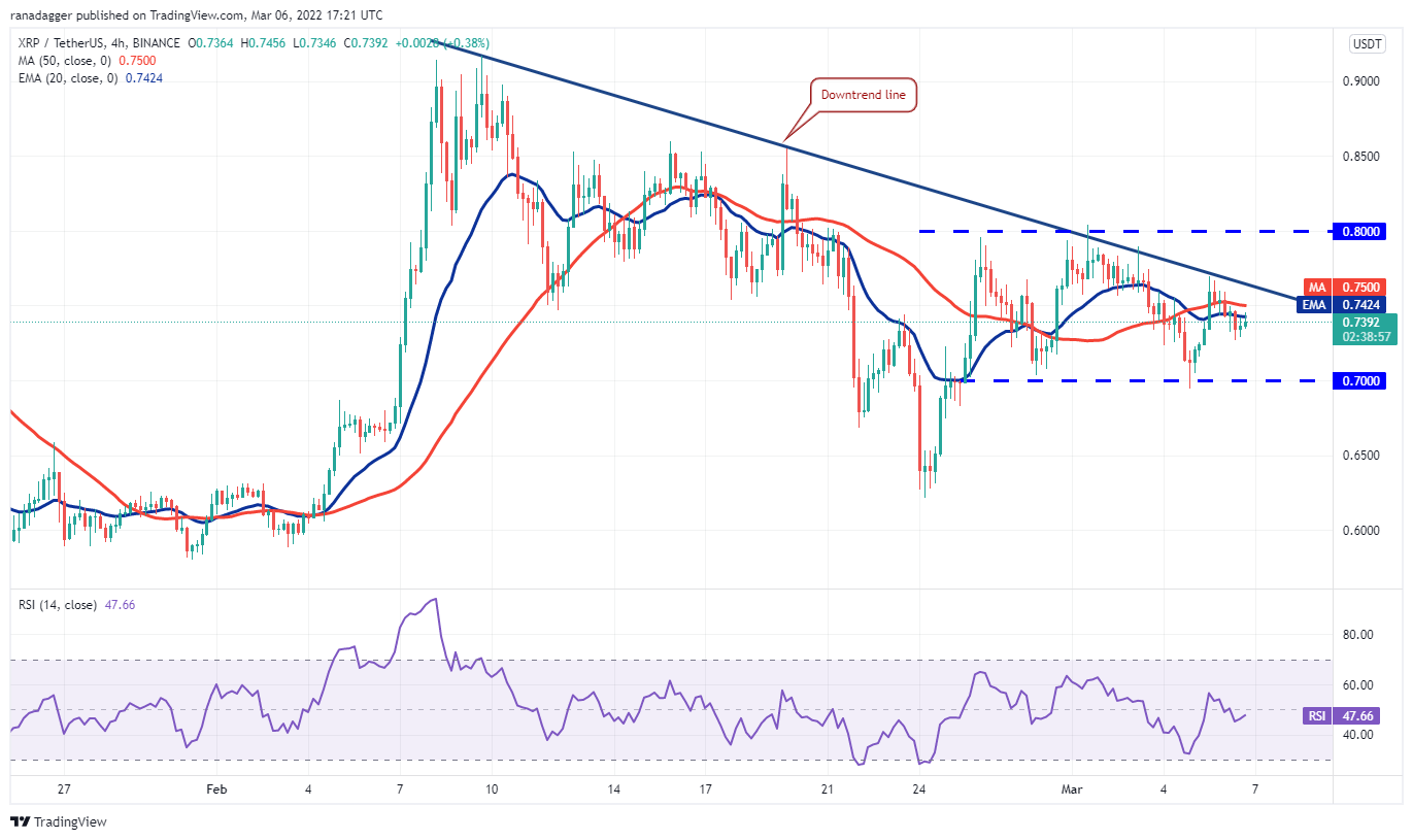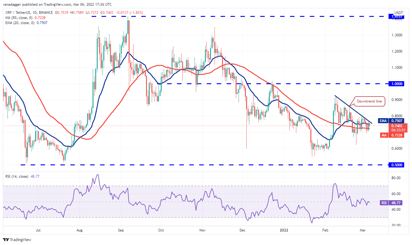 Ripple (XRP) has been attempting to rise above the downtrend line for the past few days but the bears have held their ground. A minor positive is that the bulls have not given up and are trying to defend the 50-day SMA ($0.72).