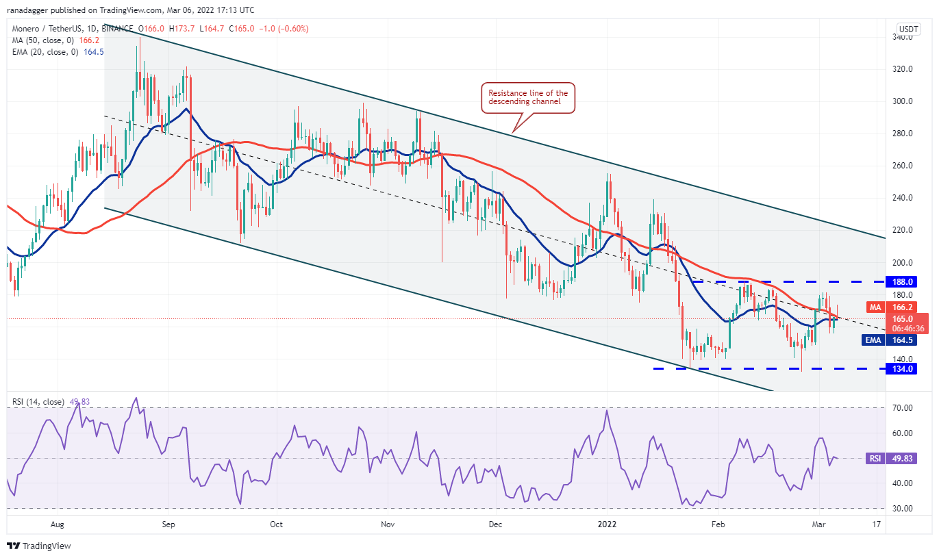 Monero (XMR) has been correcting inside a descending channel for the past several weeks. The bulls are buying the dips to $134 and attempting to form a basing pattern.