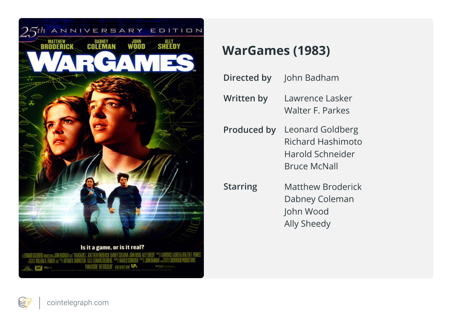 https://images.cointelegraph.com/images/840_aHR0cHM6Ly9zMy5jb2ludGVsZWdyYXBoLmNvbS91cGxvYWRzLzIwMjMtMDMvNjM2MDk0OTMtODRhYi00OTU0LThlZDAtMzI5YThlY2E2NGM1LmpwZw==.jpgMovies about hacking and cybersecurity, such as WarGames, The Matrix and Mr. Robot, have helped viewers explore the potential risks of technology.