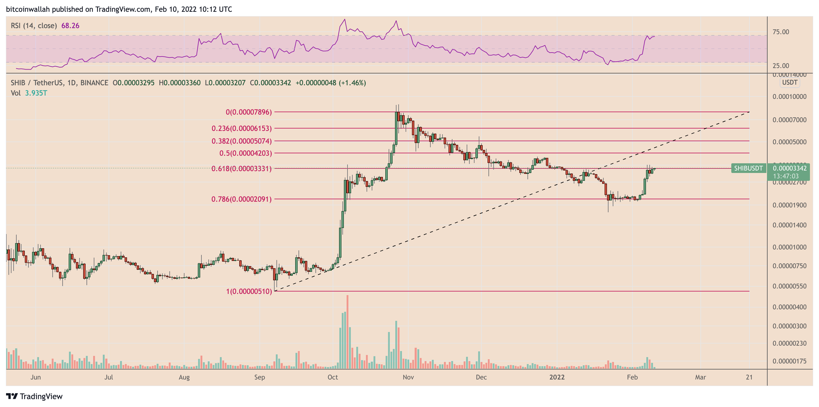 Unlike Dogecoin, Shiba Inu has been holding its recent gains. On Thursday, SHIB was trading merely 5% lower than its year-to-date high of $0.00003523 while eying a breakout above its interim resistance level of $0.00003331.