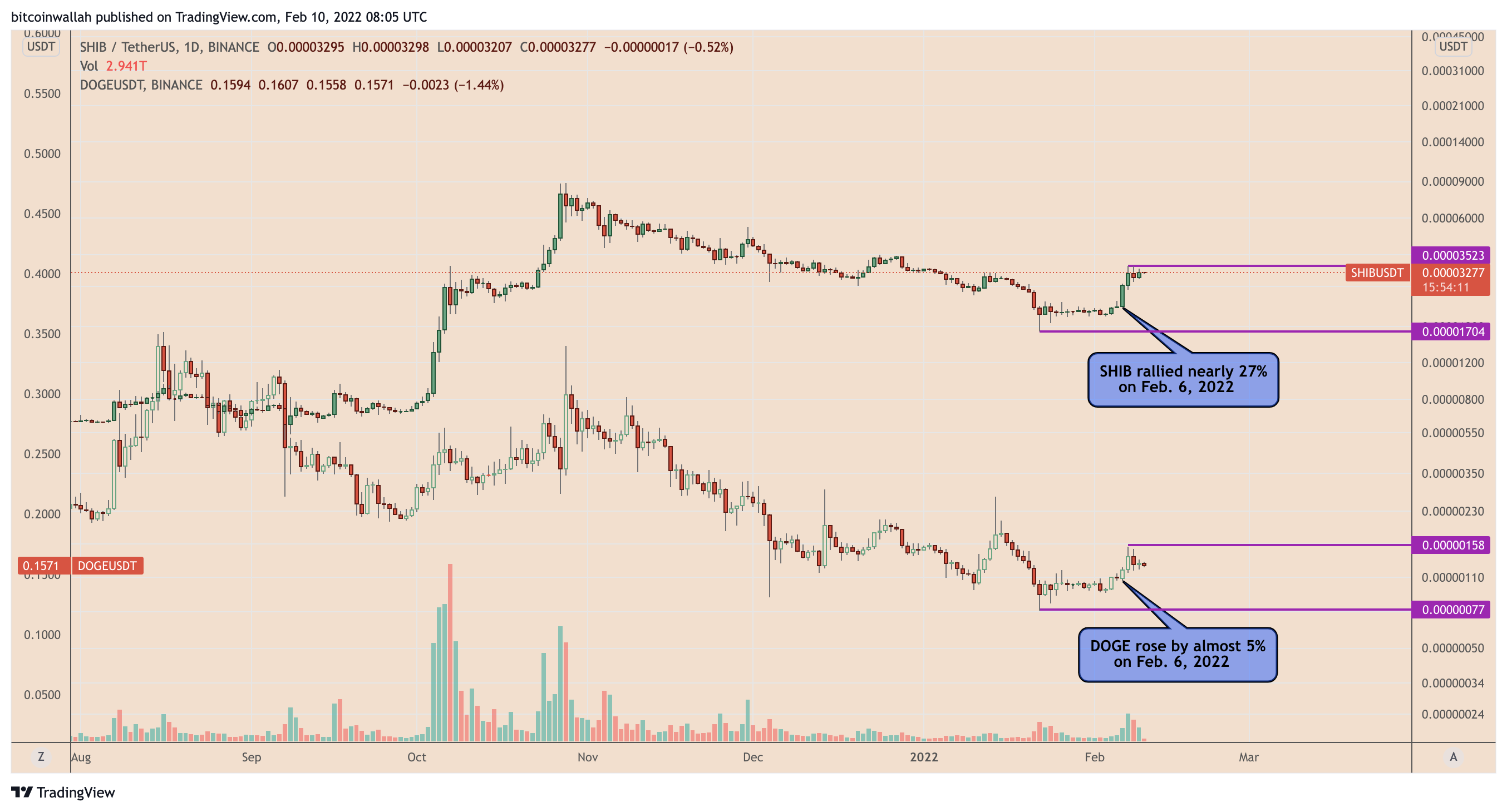 Most of the February’s — and, in fact, 2022’s — gains in the SHIB market surfaced on two dates: Feb. 6 and 7. SHIB’s price rose by a net 41% led by back-to-back optimistic updates in the Shiba Inu market compared to DOGE’s 12.5% gain.