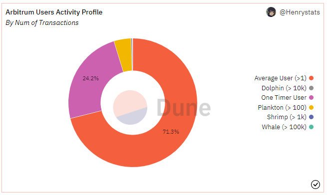 Despite the massive growth pushing Arbitrum over the 5M account mark, it appears as though weekly user activity has dropped significantly since the Mar. 20 high of 1.38 million to around 333,000 users, a number more in line with Arbitrum’s pre-airdrop activity. While 83.7% of all ARB accounts, per Dune Analytics, have at least one transaction, extrapolating the data further tells the rest of the story. Of the more than five million total Arbitrum accounts, 24.2% of those accounts have only one transaction, possibly indicating a pool of users who sold their ARB right after receiving the airdrop.