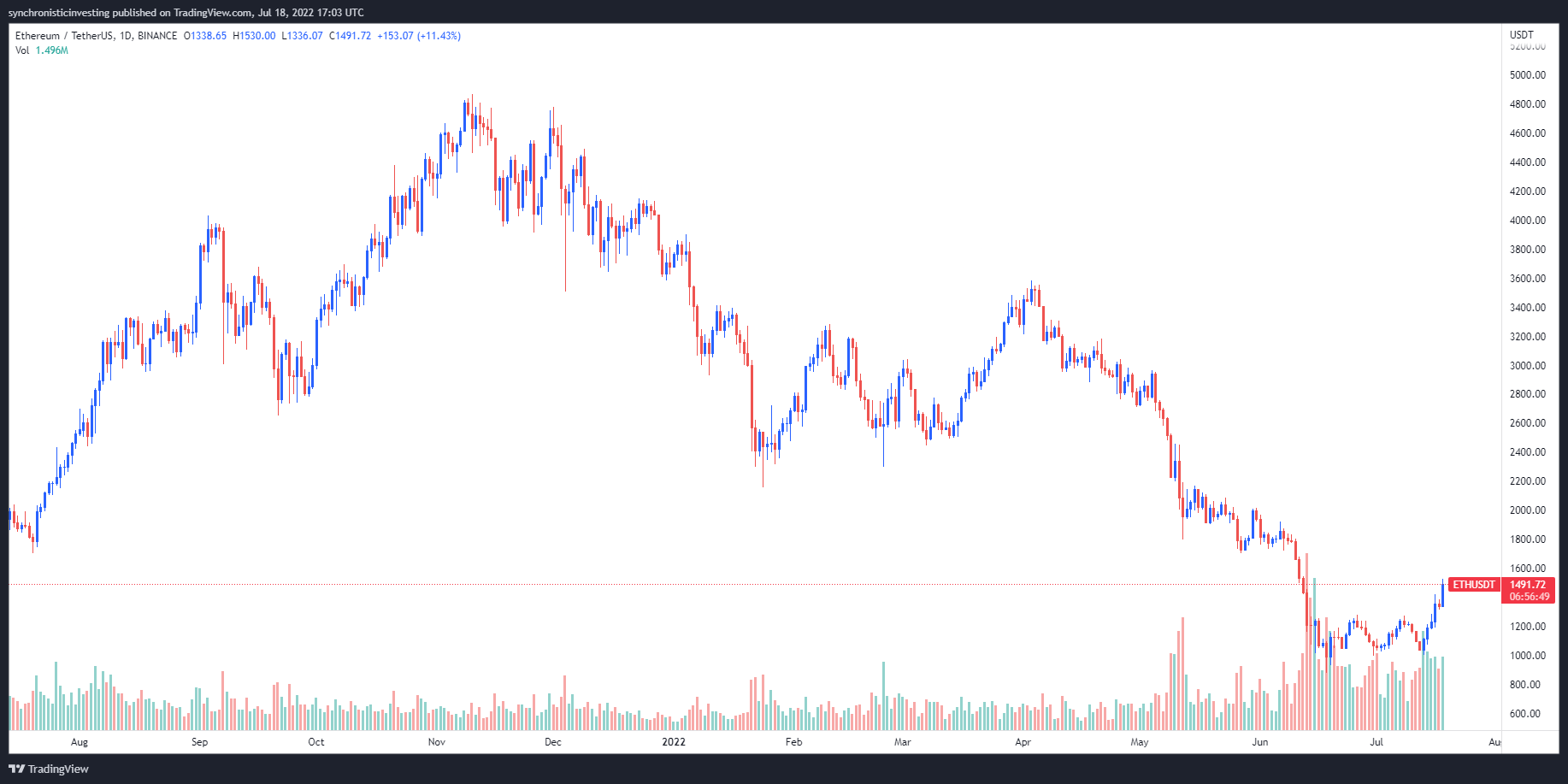Ethereum (ETH) has also experienced a boost in momentum and price over the past week, climbing 43% from a low of $1,005 on July 13 to a daily high at $1,530 on July 18, reaching its highest price since June 12.