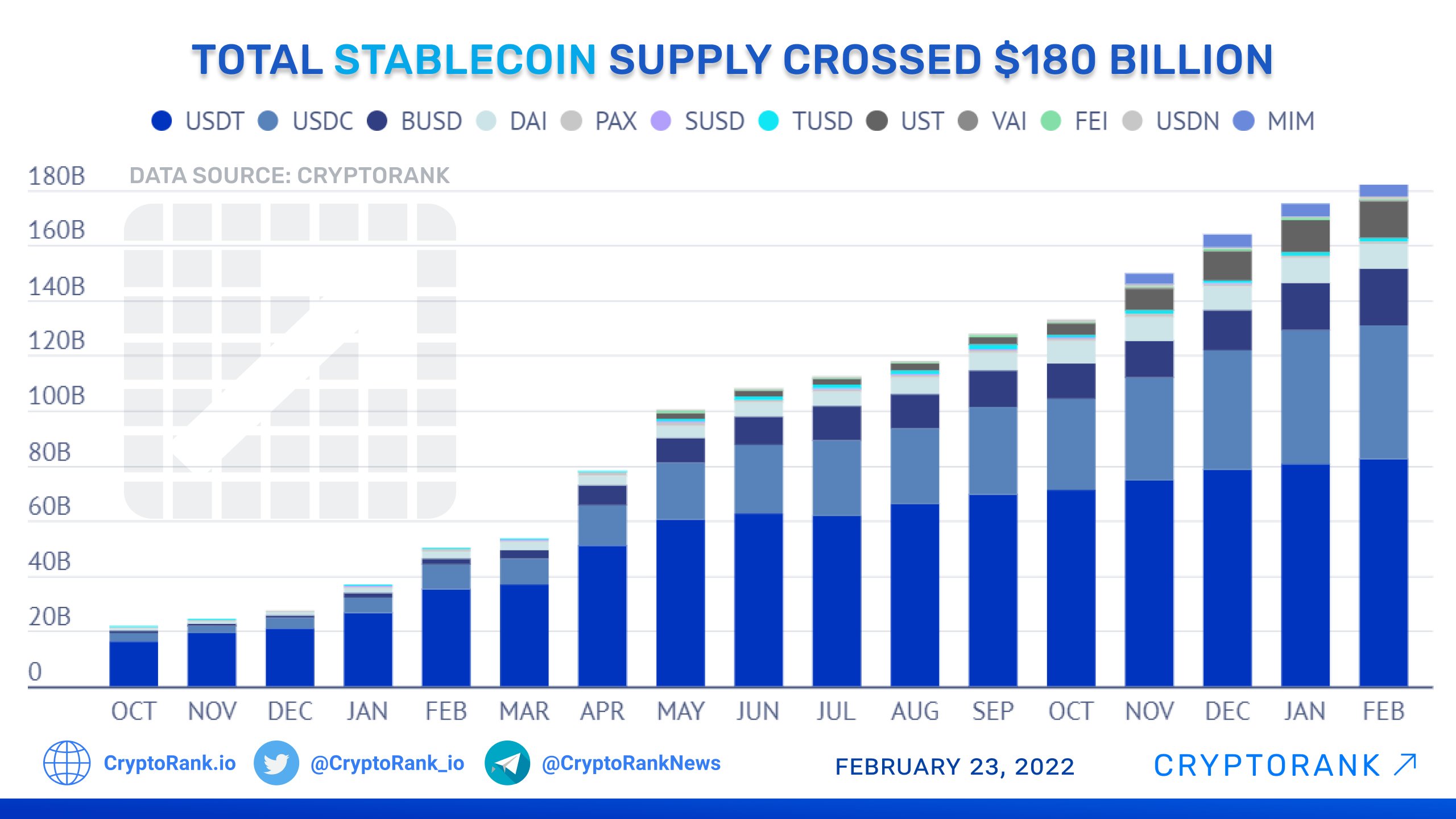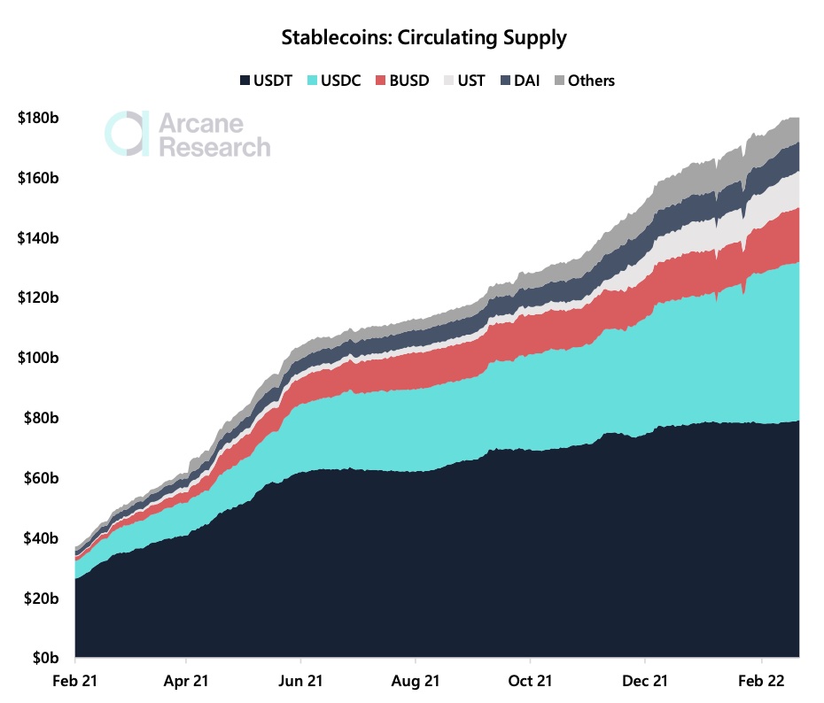 https://images.cointelegraph.com/images/840_aHR0cHM6Ly9zMy5jb2ludGVsZWdyYXBoLmNvbS91cGxvYWRzLzIwMjItMDIvZDhlZjdjZmYtMmM1MS00NTZiLTk2Y2YtOGRjY2RjODQ1ZjU1LmpwZw==.jpgMove aside Bitcoin (BTC), stablecoins are holding the spotlight. Crypto research outlets Arcane Research and CryptoRank confirm that the stablecoin supply has hit the milestone amount of $180 billion.